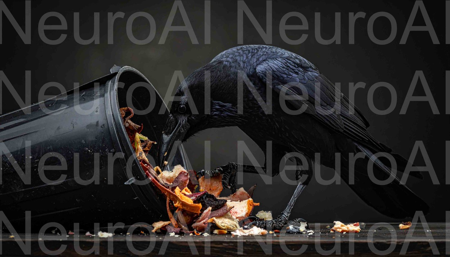 Raven eats discarded food from trash can darkly