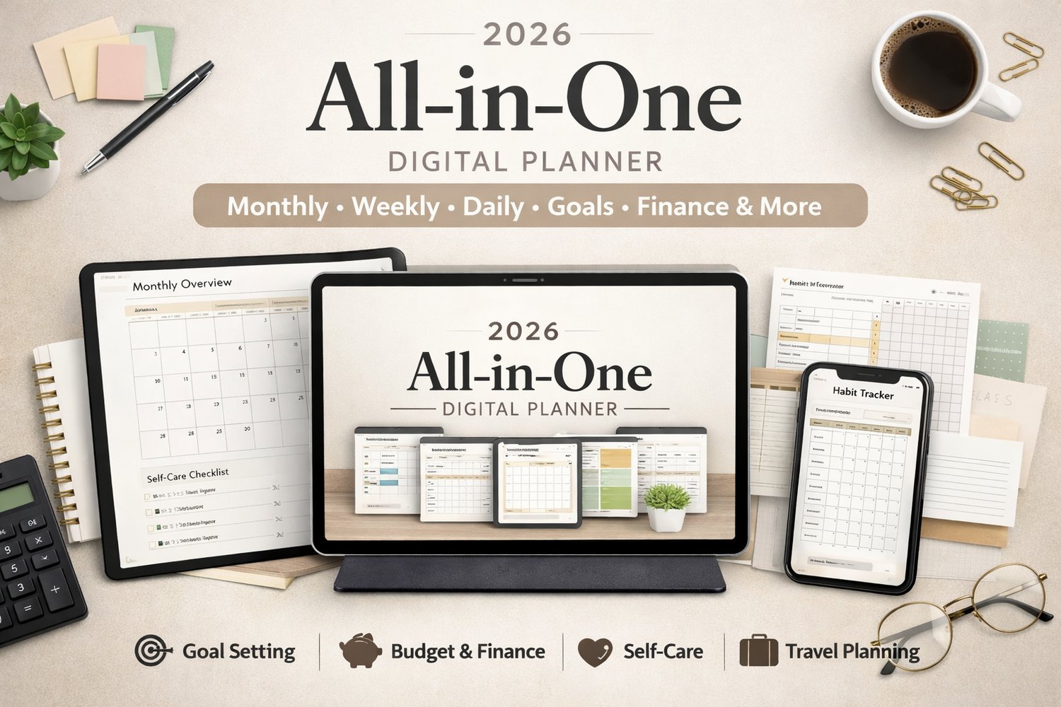 2026 All-in-One Digital Planner – Monthly, Weekly, Daily, Goals & Finances