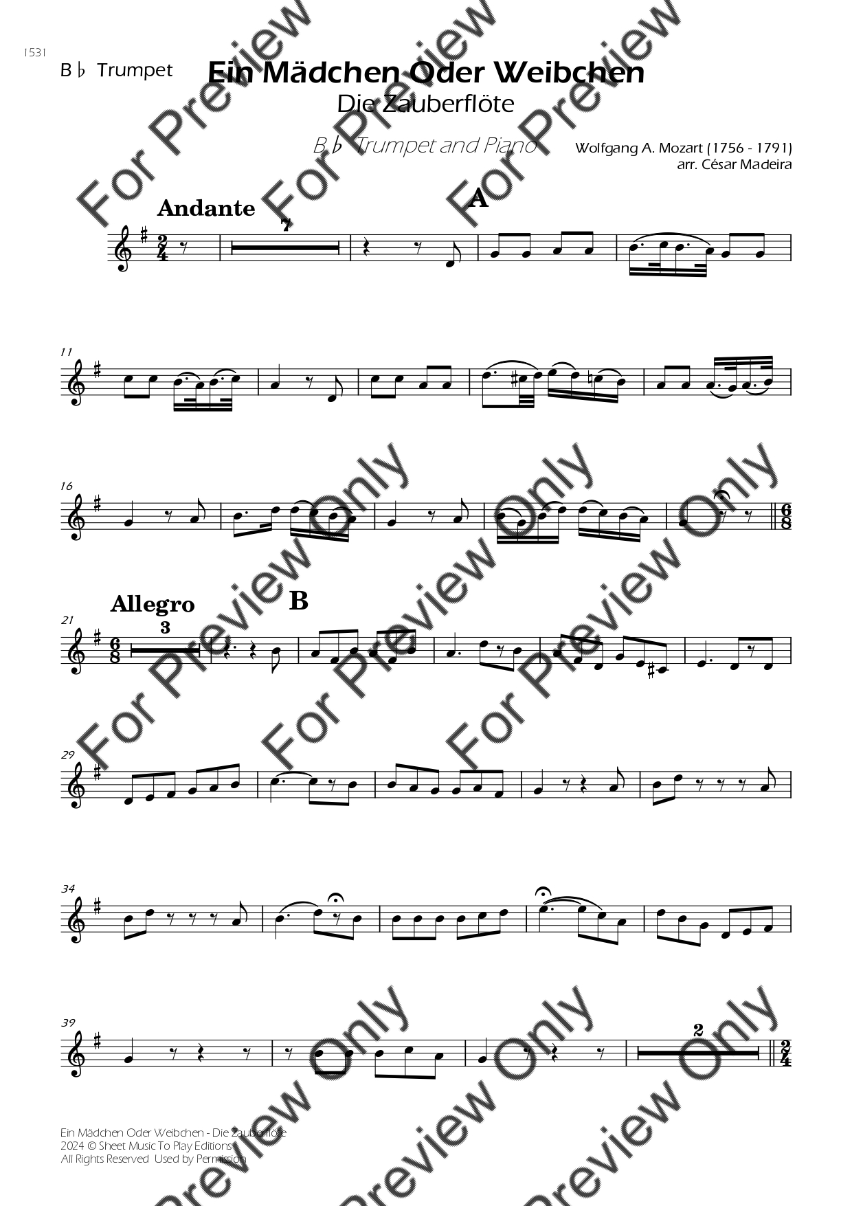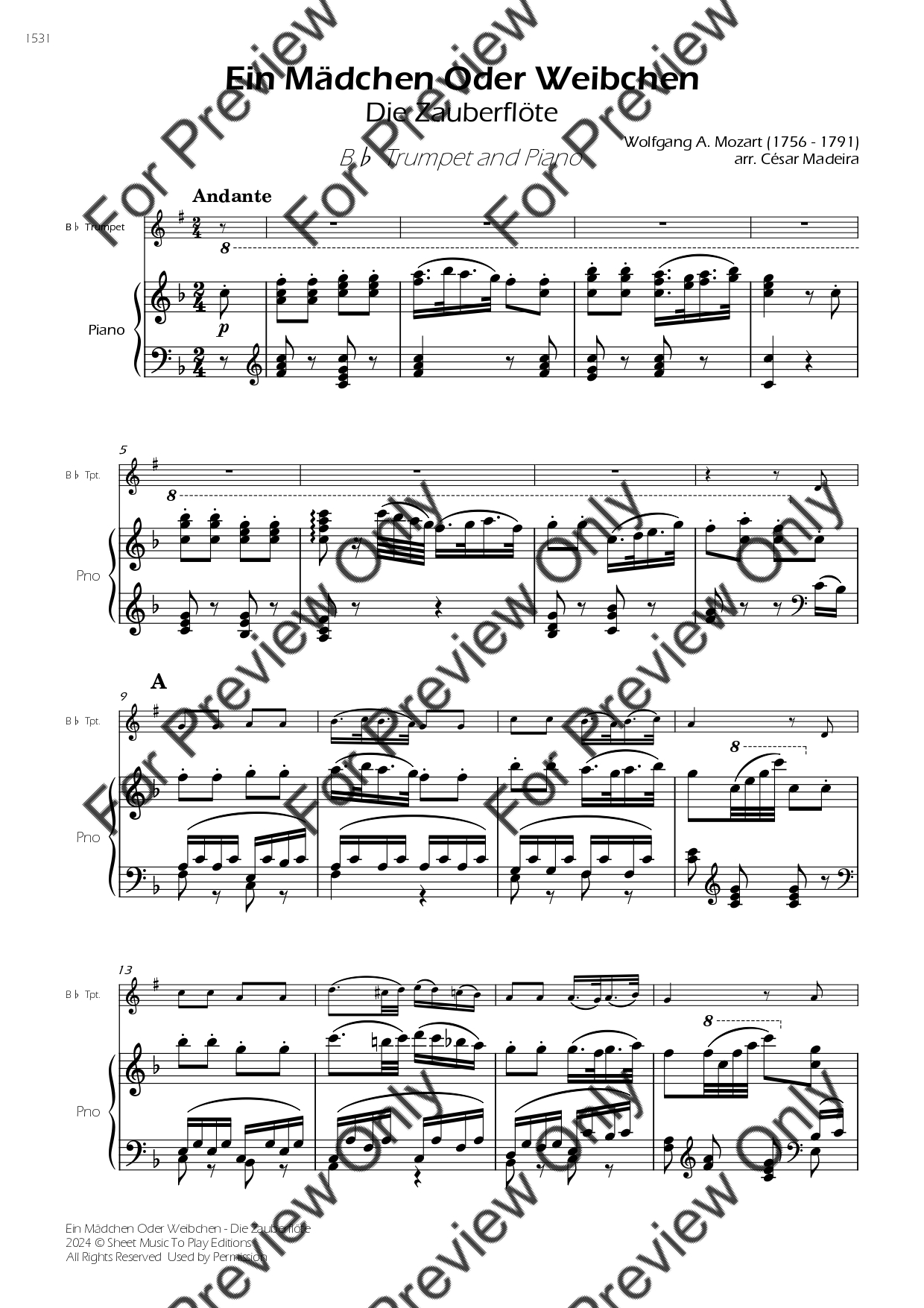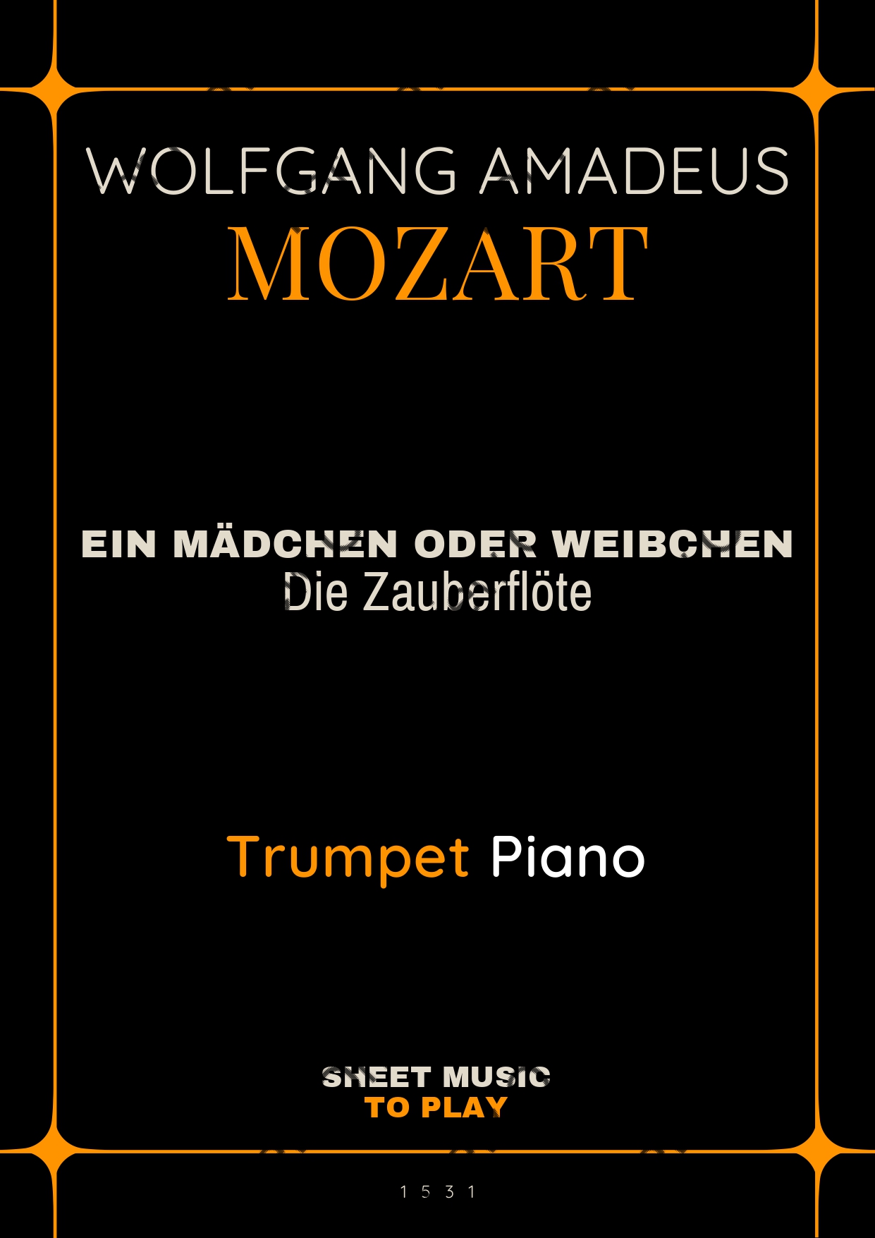 Ein Mädchen Oder Wiebchen from The Magic Flute by Wolfgang Amadeus Mozart. Arrangement for Bb Trumpet and Piano. With Full Score and Individual Parts. Have fun!