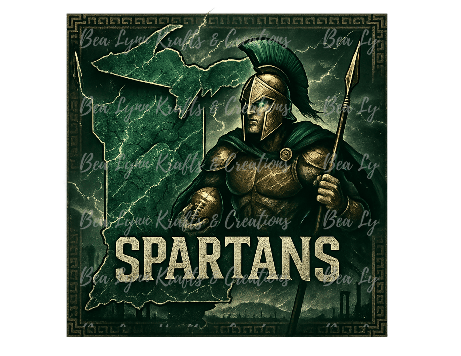 SPARTANS, STAND AND FIGHT! This high-impact Michigan State Spartans PNG merges battlefield grit with Big Ten pride in a bold square layout. A war-hardened Spartan warrior—helmet gleaming and cloak flowing—stands guard beside a cracked, rune-textured Michigan map glowing in green and bronze. “SPARTANS” is carved across the state in jagged marble-style lettering, while lightning arcs and ancient Greek borders add fury to the scene. Distant columns, storm clouds, and battlefield silhouettes complete the war-torn energy. Created in a 1028x1028 square transparent PNG, it’s built for bold merch that screams tradition and toughness.