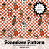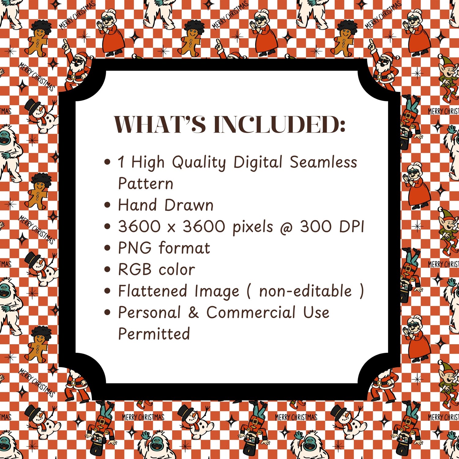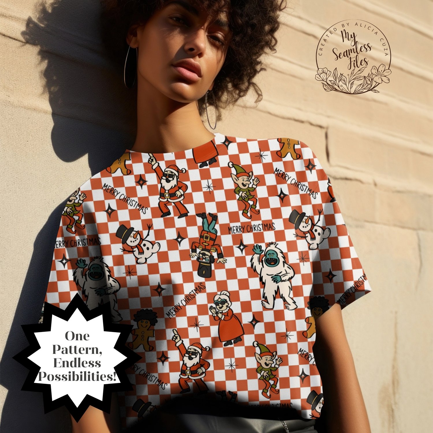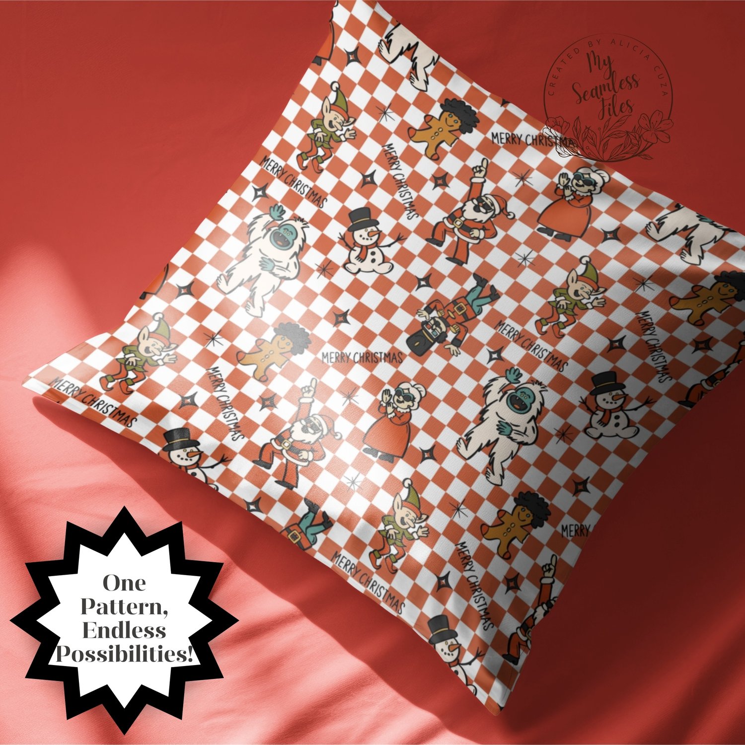 Get into the holiday spirit with this fun red checkerboard Christmas characters seamless pattern! This digital download features an adorable hand-drawn crew of dancing holiday friends on a classic retro checkerboard background, perfect for creating unique Christmas projects that stand out.