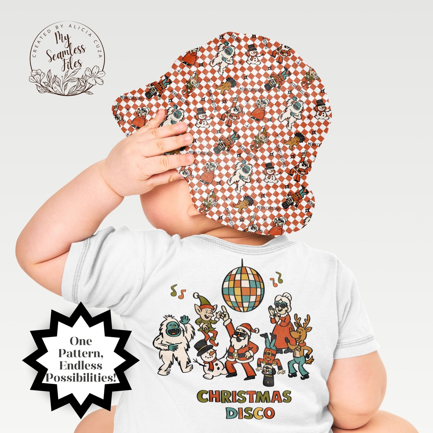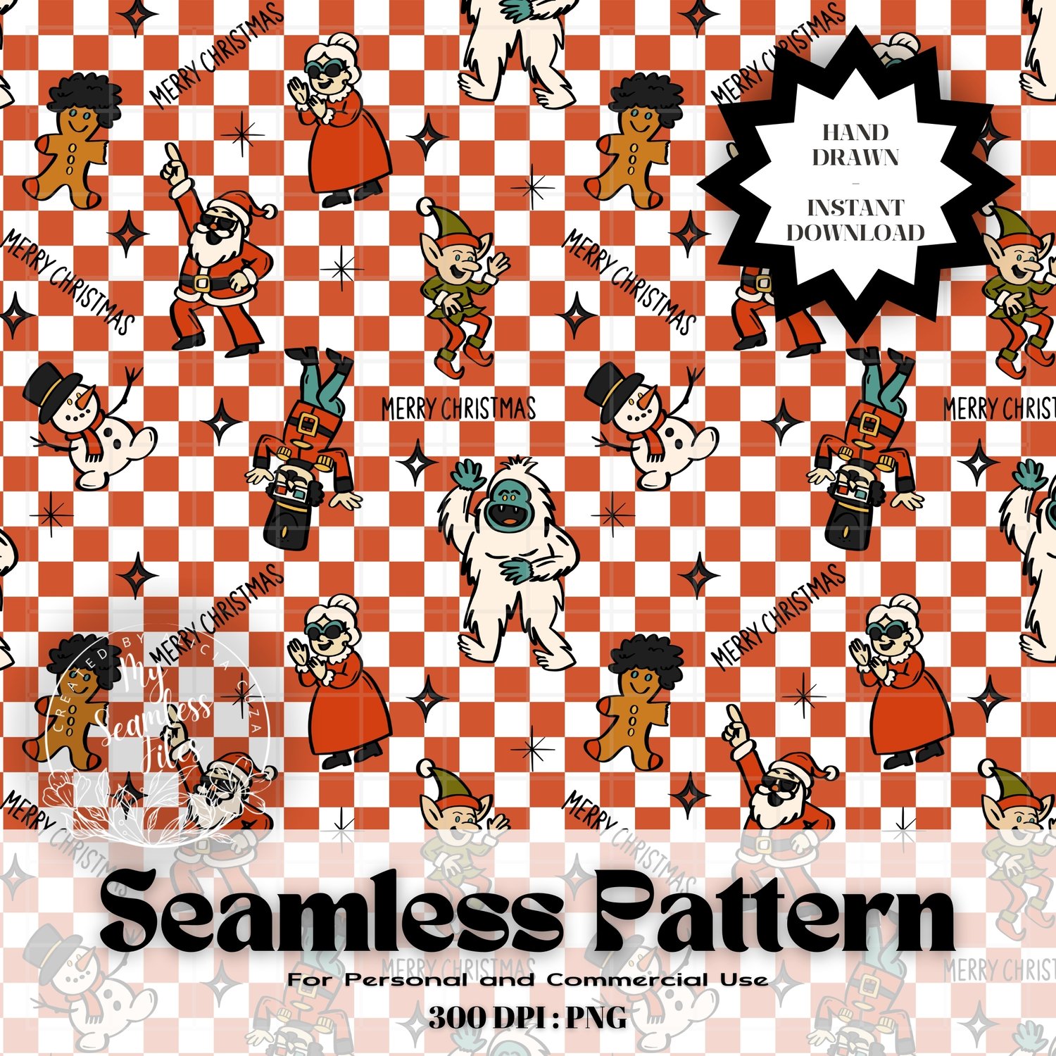 *** INSTANT DOWNLOAD - Hand-Drawn Retro Disco Dancing Christmas Character Checkerboard Seamless Pattern - Perfect for Retro & Vintage-Inspired DIY Designs!