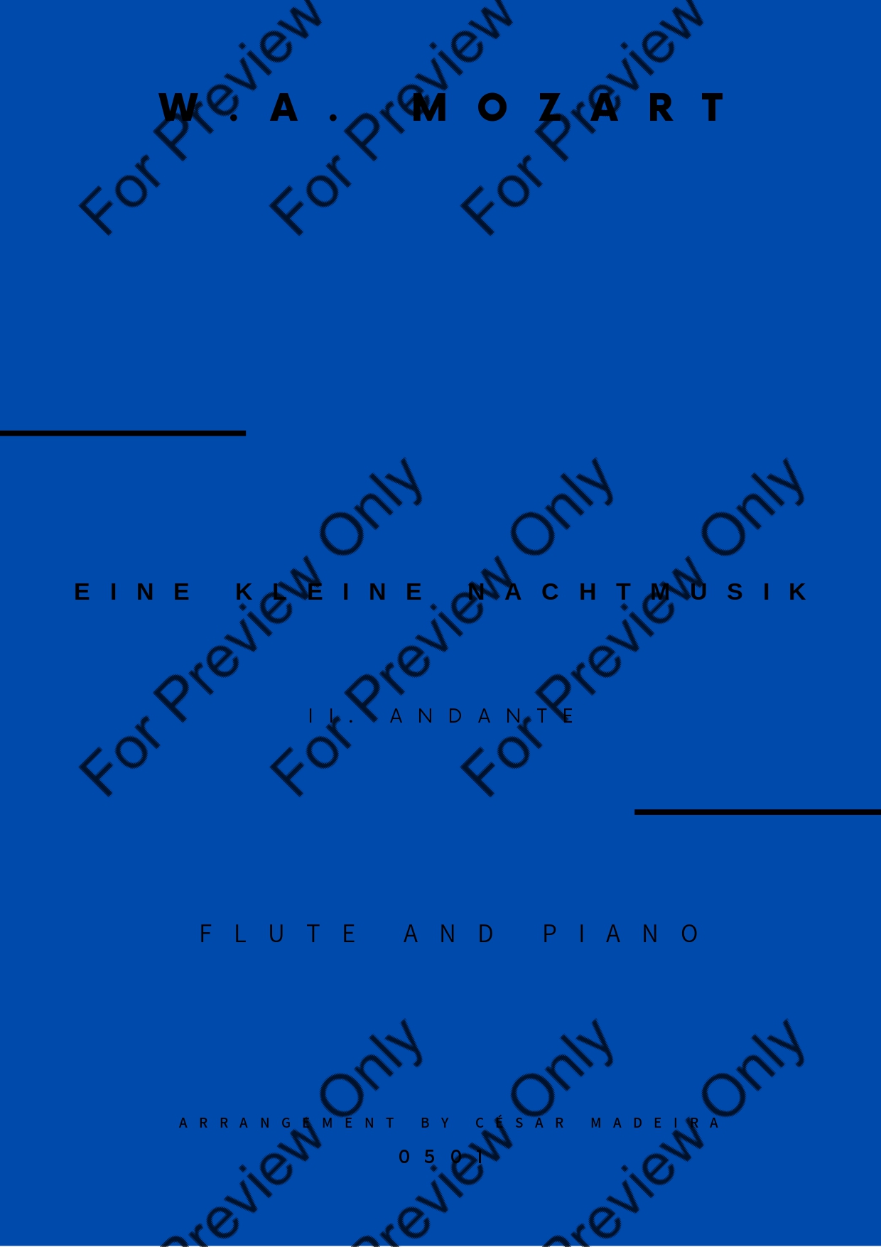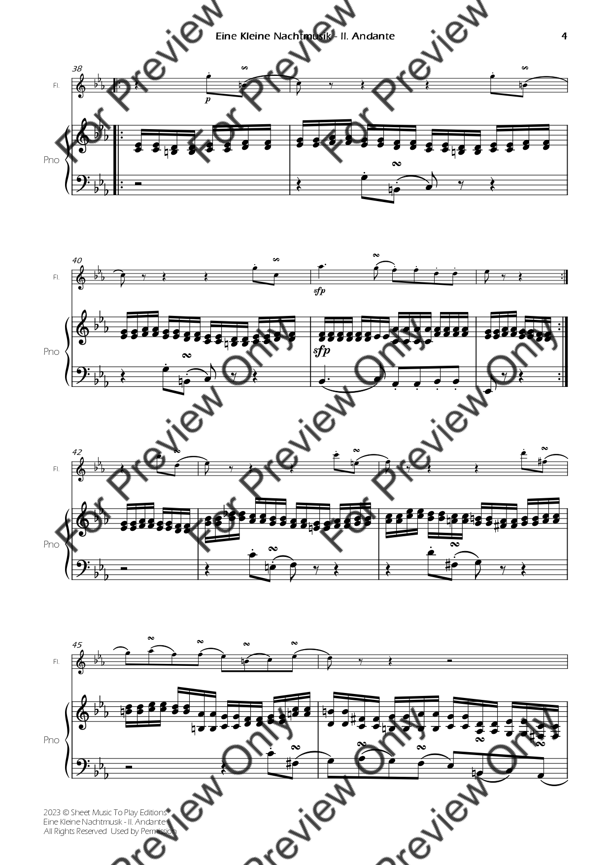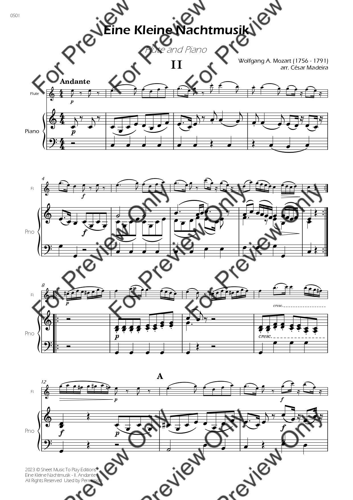 Eine Kleine Nachtmusik (2 mov.) by Wolfgang Amadeus Mozart. Arrangement for Flute and Piano. With Full Score and Individual Parts. Have fun!