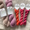 These two main colours are worked alongside three contrast colours of of 4ply/fingering-weight yarns in mini-skein amounts. The contrast colours mostly play against yarn B in the shawl, so they should contrast well with B.