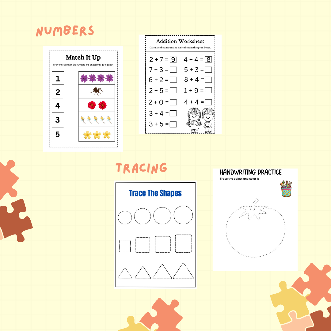 An extensive collection of over 4000 Preschool to Kindergarten Activity Sheets. Each sheet is carefully designed to foster early educational development, offering a vast array of interactive and engaging tasks that cover alphabets, numbers, shapes, colors, and beyond. From hands-on 'Do-a-Dot' activities to creative 'Color by Number' exercises, this collection is a treasure trove of resources aimed at stimulating young minds.