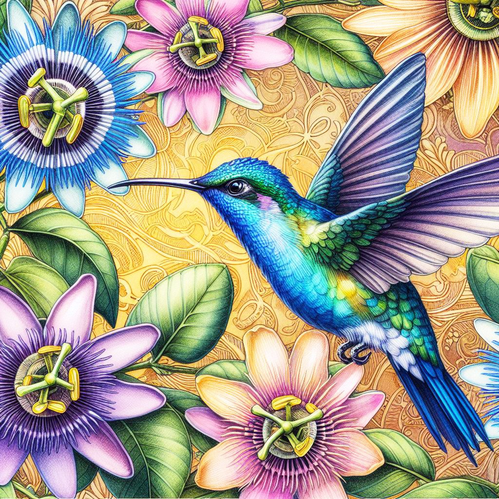 Beautiful & colourful humming birds on bright passion flowers with an embossed gold background.