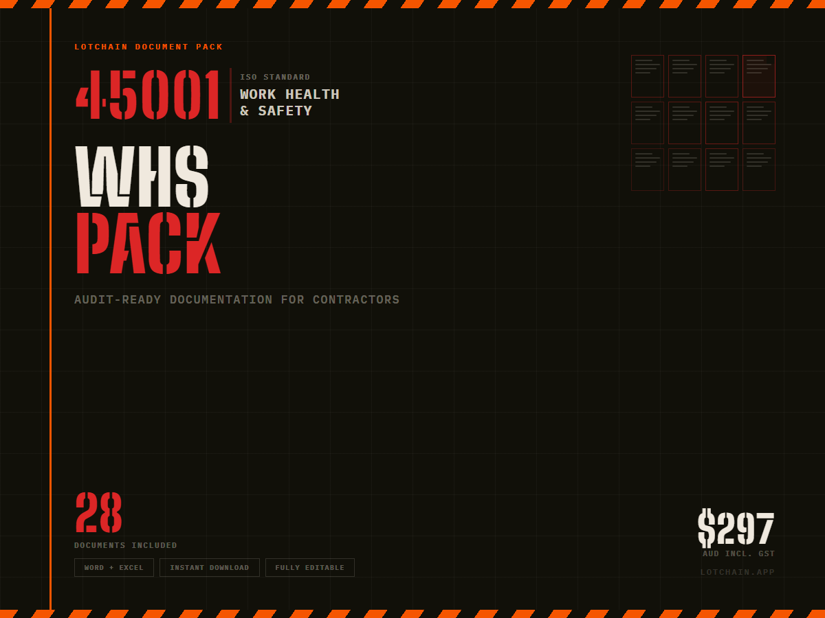 ISO 45001:2018 work health and safety management system for site-based contractors. Includes WHS manual, policy, procedures, hazard and incident registers, training matrix, and clause reference matrix.
