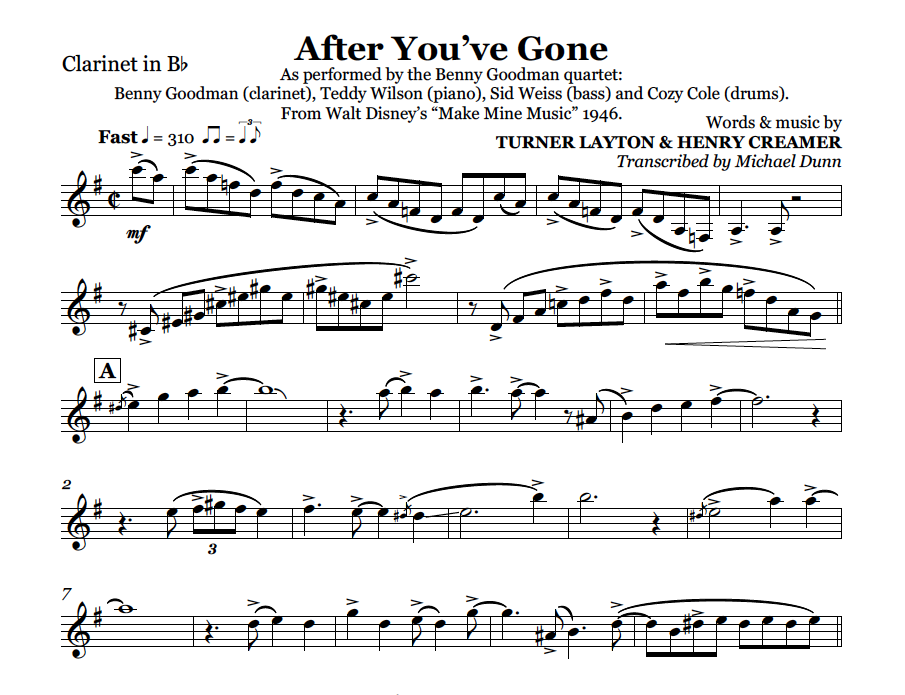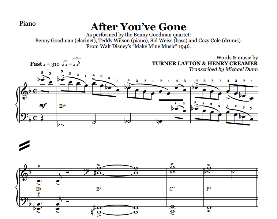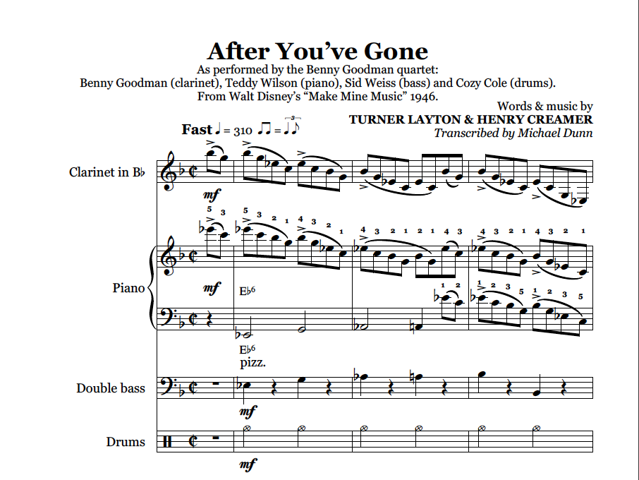 Here’s my transcription of the tour-de-force ensemble performance by the Benny Goodman quartet of After You’ve Gone, featuring the brilliant swing piano of Teddy Wilson. Originally featured in the Walt Disney jukebox-style animated film “Make Mine Music” from 1946, the music accompanied an amazing surreal animation sequence. It was later released as an animated short called "2 for the Record" in 1954 with an accompanying 45 single.