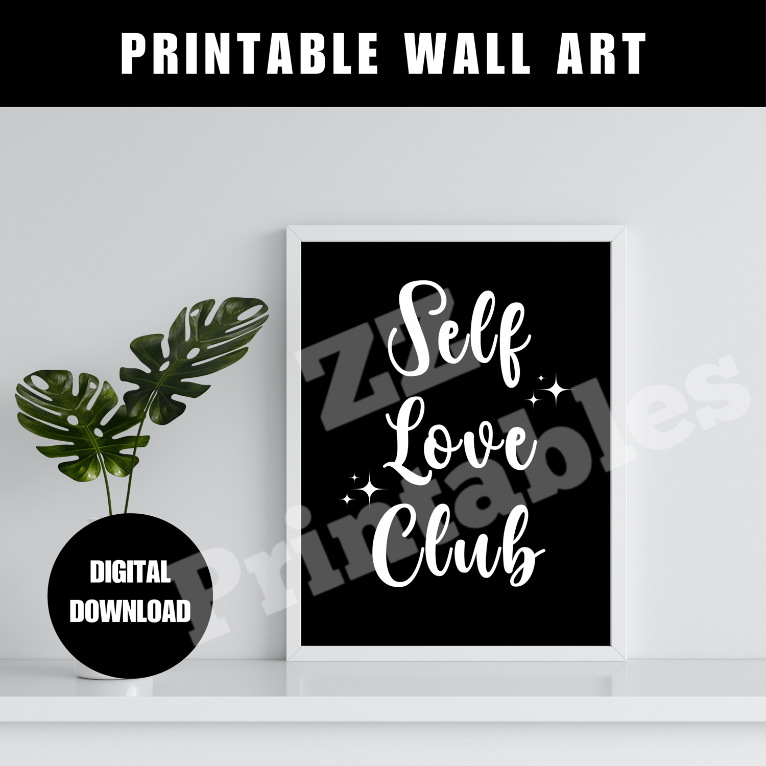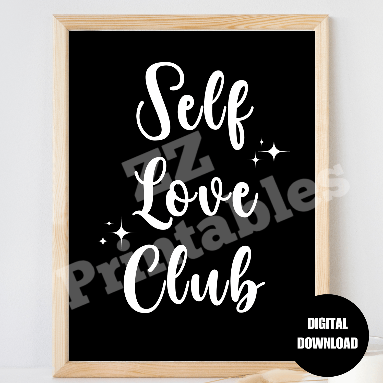 Self Love Club Poster Quote Wall Art Black White Text Print Trendy Typography Living Room College Dorm Decor Printable Digital Download JPEG. The design comes in 5 different sizes. The digital download consists of a zipped file containing 5 high quality JPEG files (300 dpi) and a PDF size chart to help you choose the right file for the printing size you want.