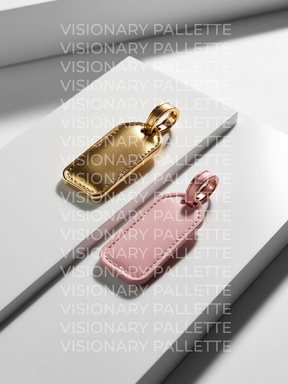 A realistic gold and pink vertical rectangle hair hang tags with a pink string through the hole