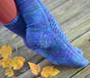 The pattern comes in three sizes to fit a range of foot circumferences. Finished measurements are 7 (8, 9) inches/17.5, 20, 22.5) cm. The sock is intended to fit a bit of negative ease. So choose a finished measurement that is 0-1.5 inches/0-3.75 cm smaller than your foot circumference at the largest point based on the amount of snugness you prefer in a sock. If you like your socks snug, choose a size that is up to 1.5 inches smaller than your foot circumference. If you like your socks looser, choose a size closer to your actual foot circumference.