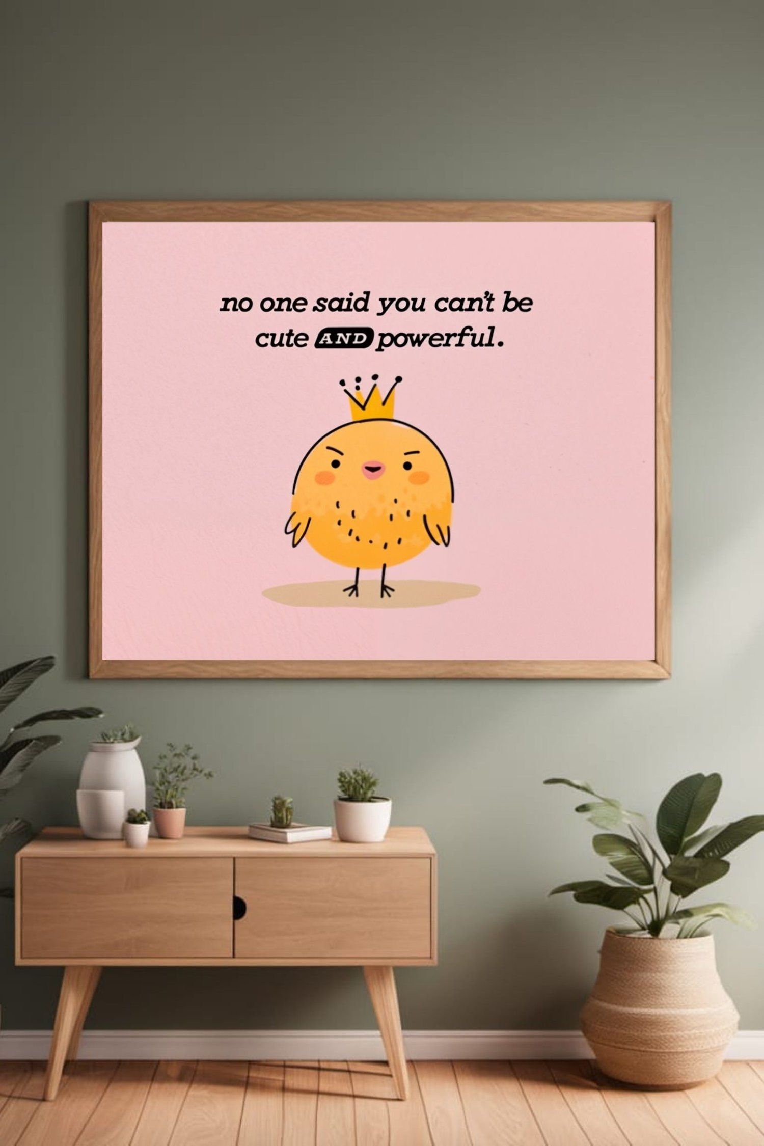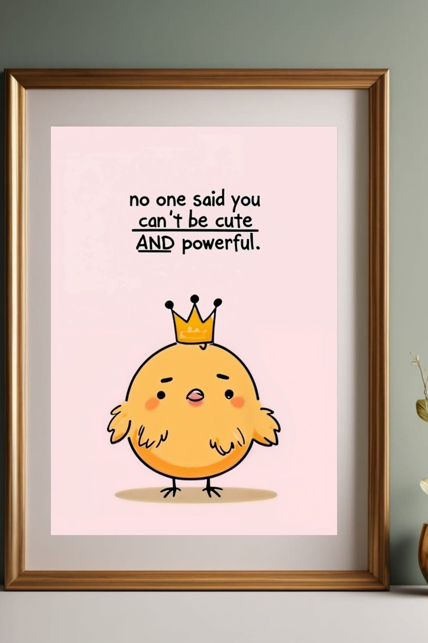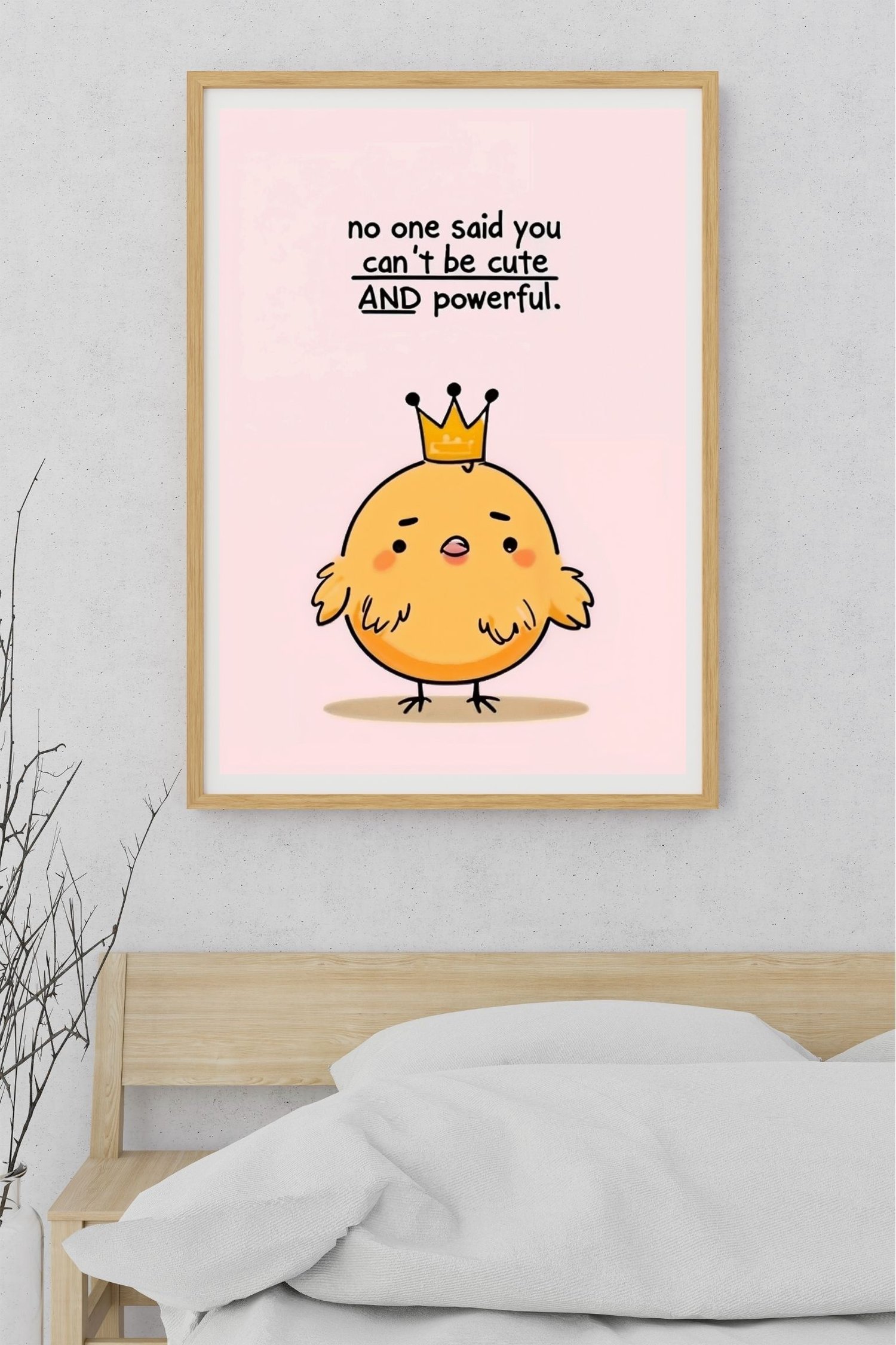 This uplifting printable features a sweet yellow chick in a crown with the empowering quote: "No one said you can't be cute AND powerful." Perfect for girls' bedrooms, kids' playrooms, nurseries, or as a thoughtful gift to encourage strength and self-love.