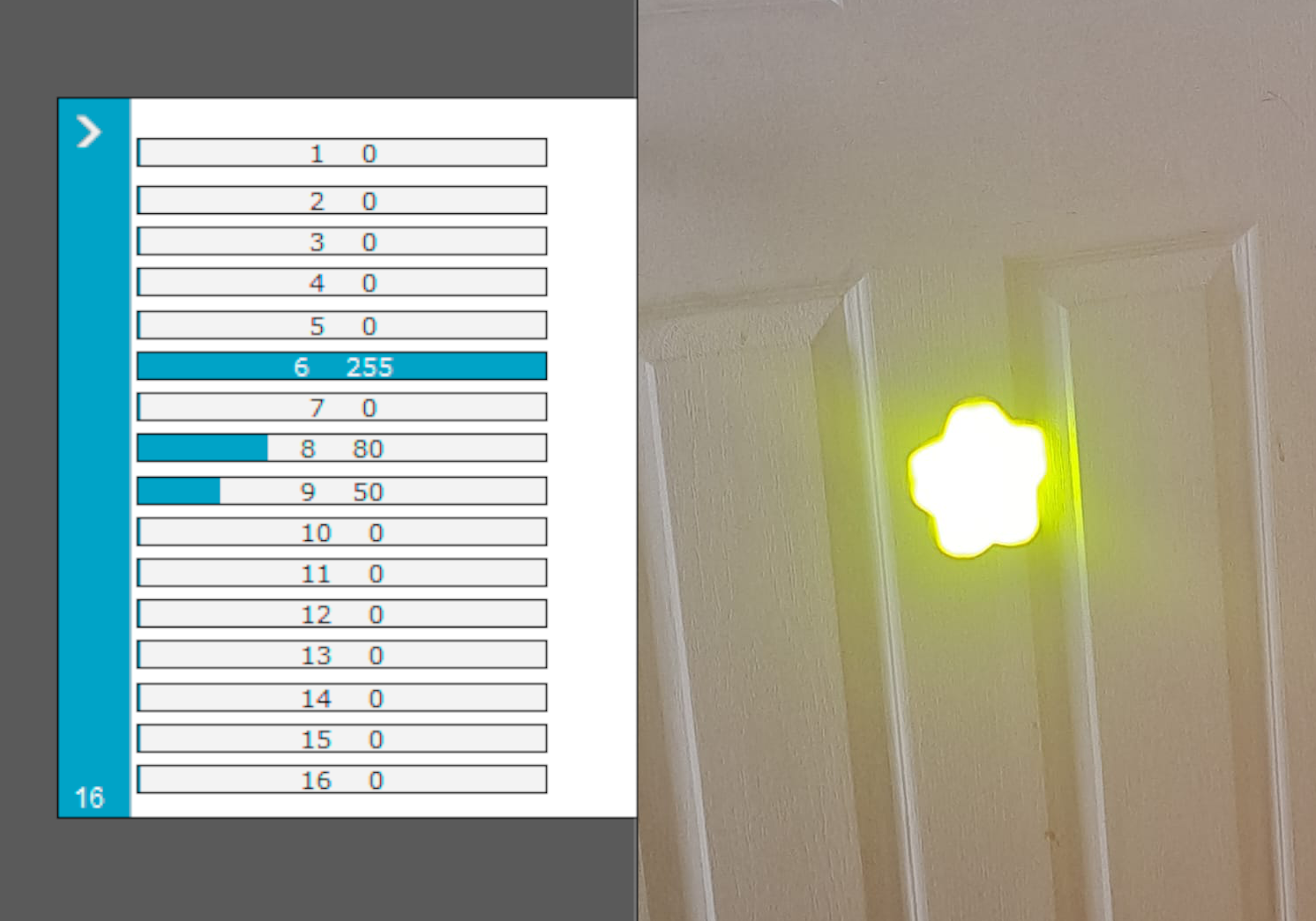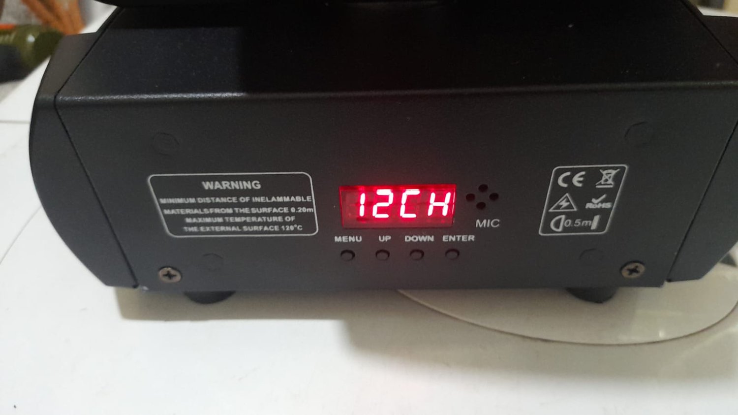 * Verifique que coincidan estos canales: 6 Dimmer, 8 en el valor 80 = Color Amarillo, 9 en el valor 50 = Gobo de estrella (ver tercer foto).