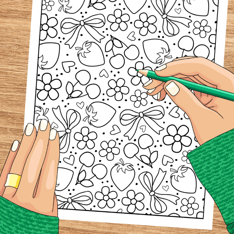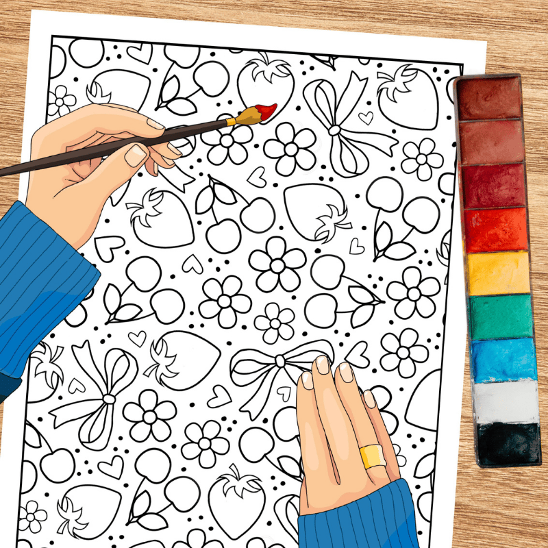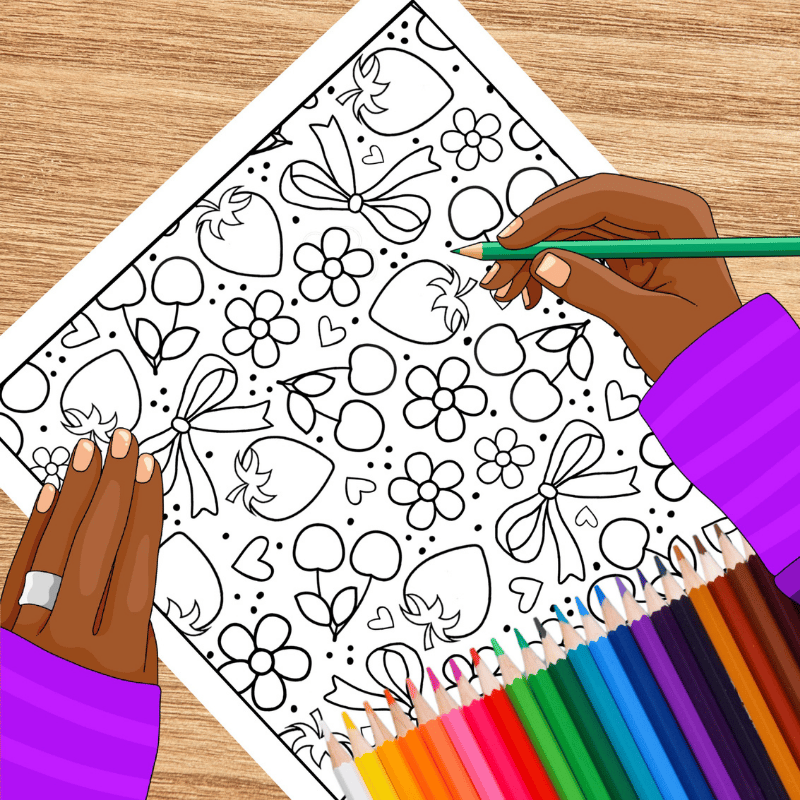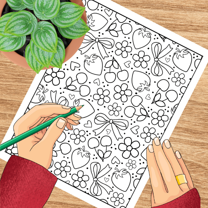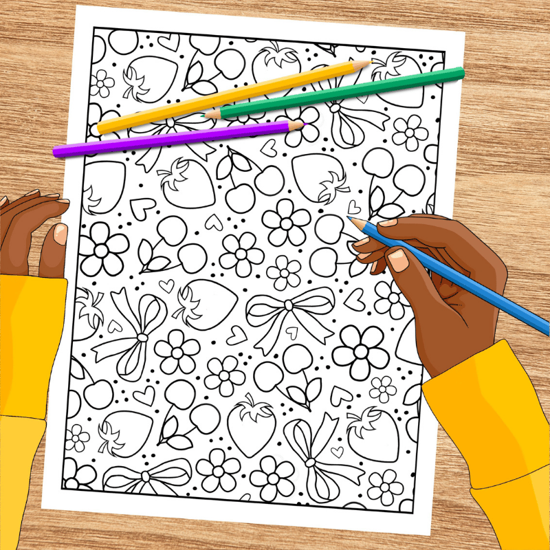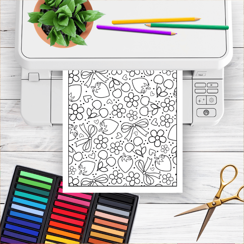 Coquette Summer Fruit Coloring Page Printable 8.5x11 Instant Download PDF & PNG File Bows Strawberries Cherries