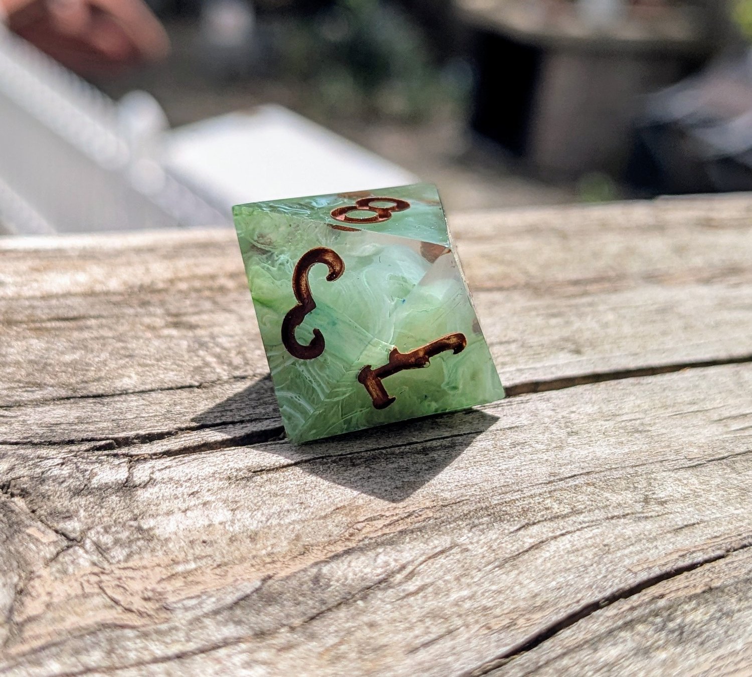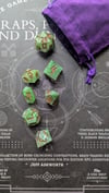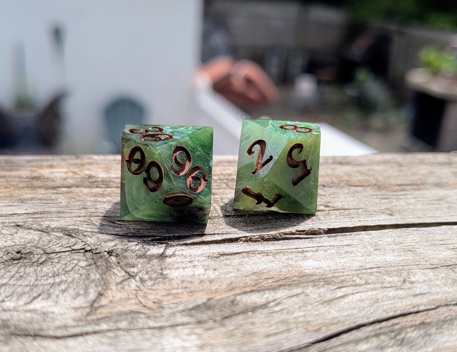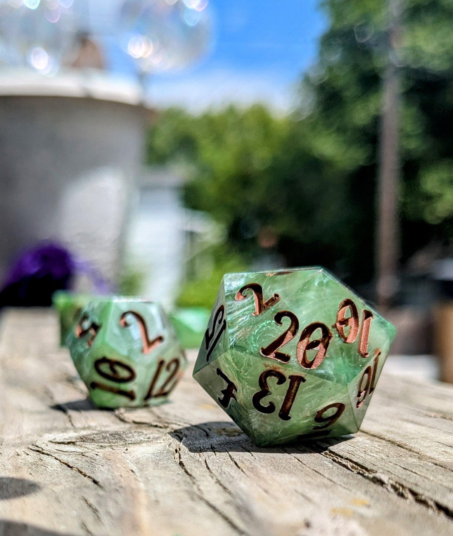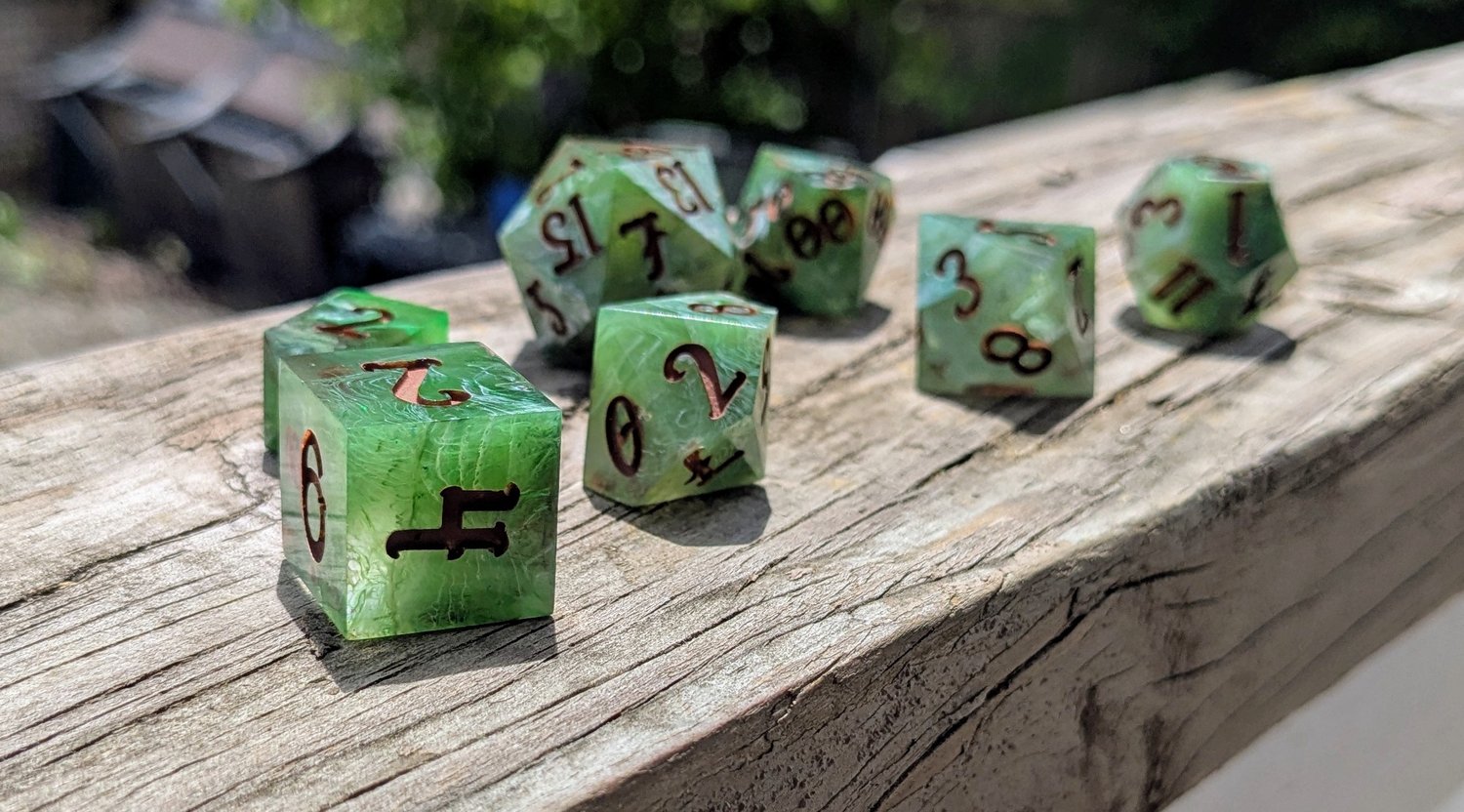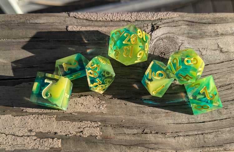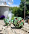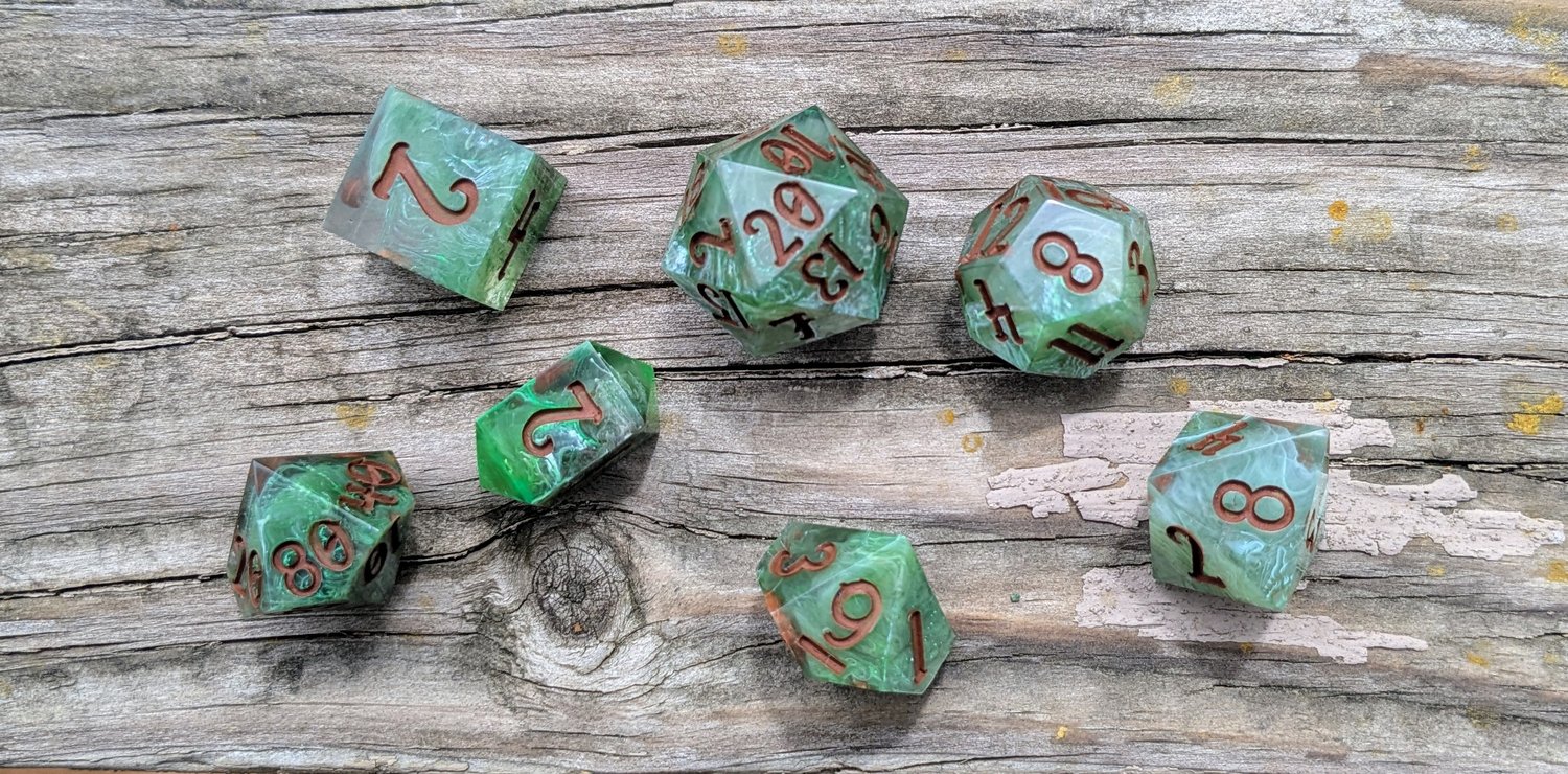 Like moss creeping over ancient stone or emerald magic pulsing from a druid’s palm, these dice hum with natural power. Layers of green resin swirl with misty white, catching the light like dew on leaves. Warm soil colored ink fills each number—like runes carved into bark by a careful hand.