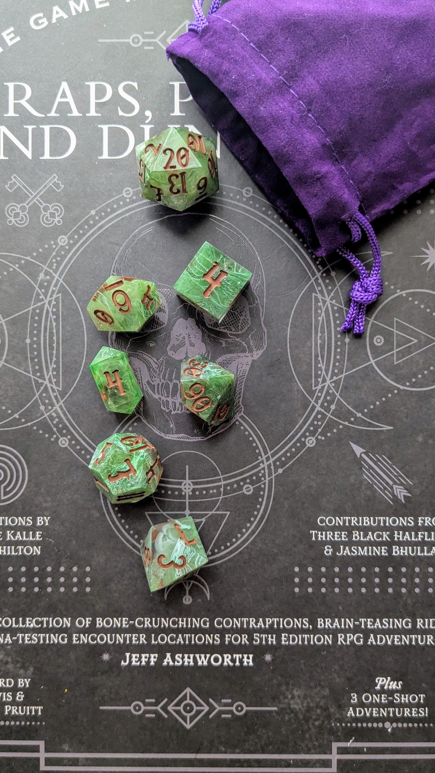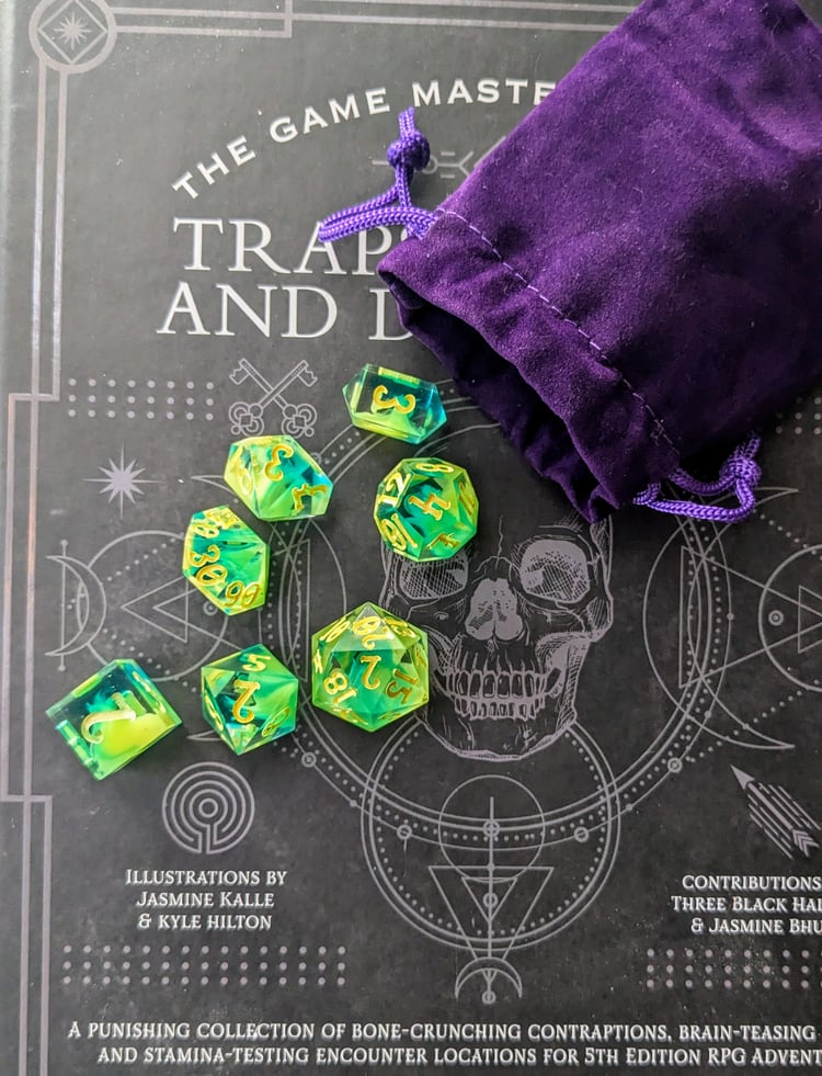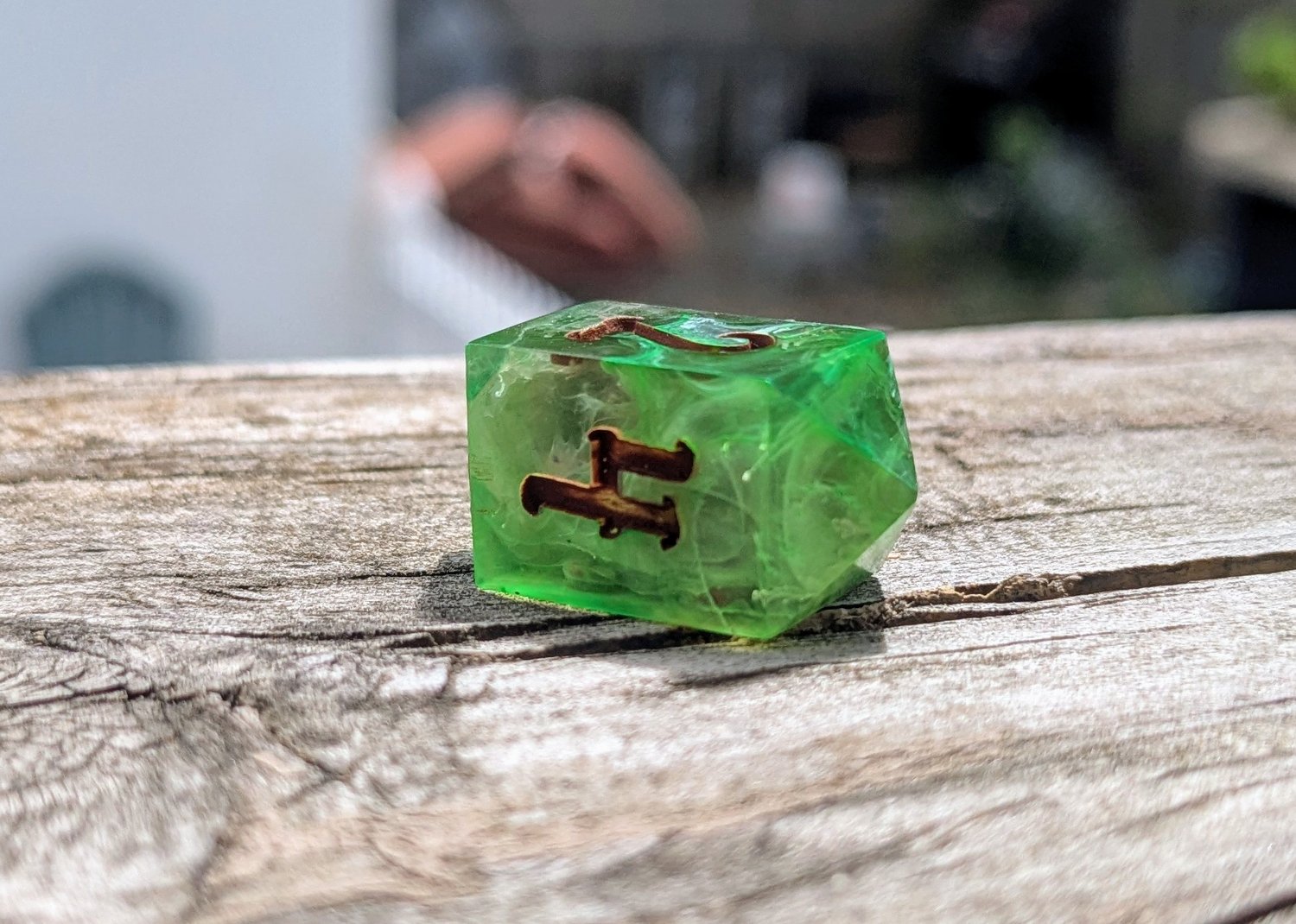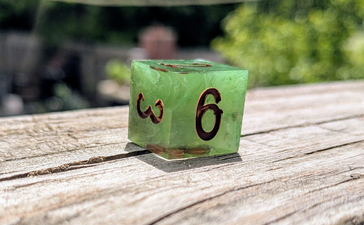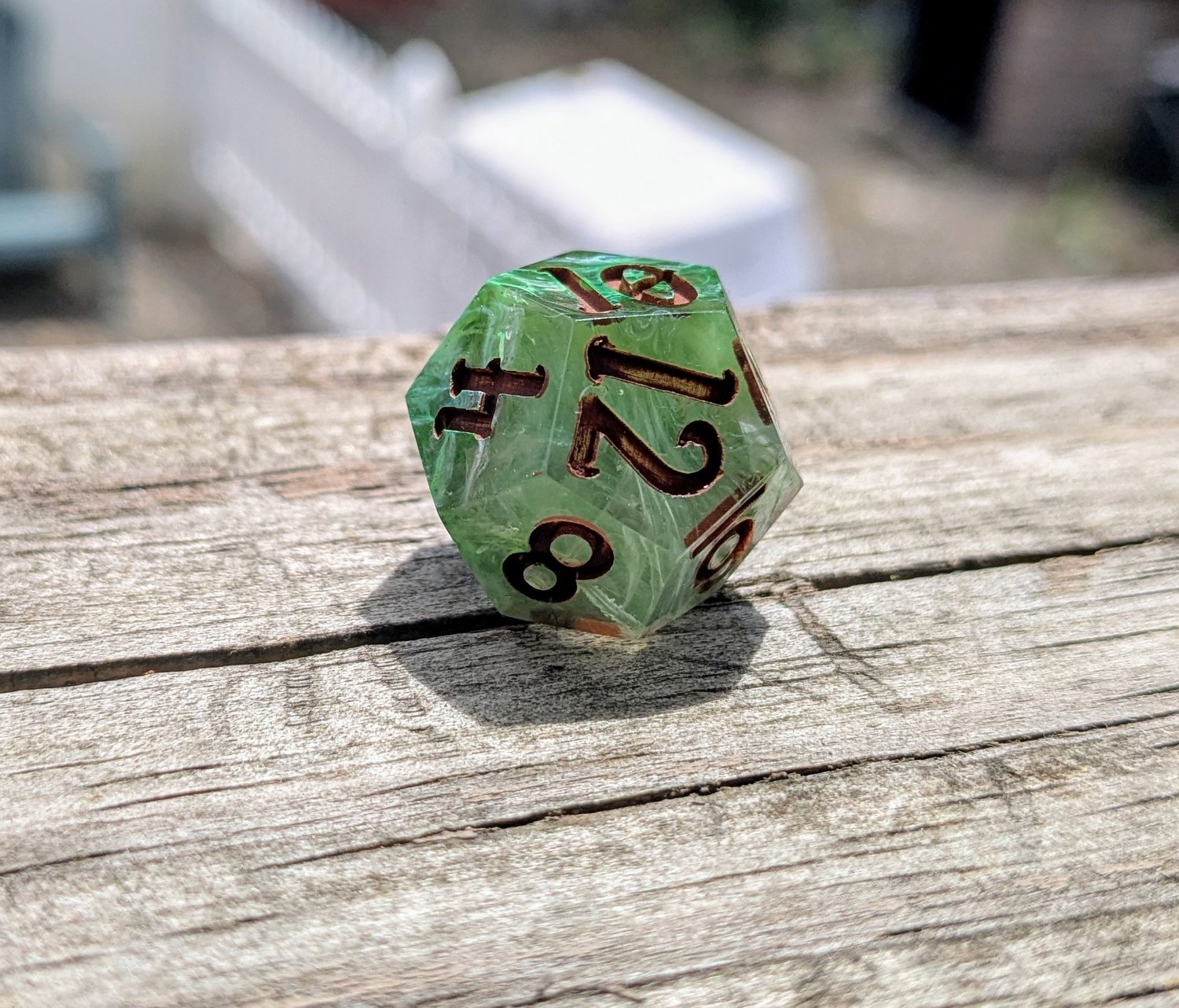 Like moss creeping over ancient stone or emerald magic pulsing from a druid’s palm, these dice hum with natural power. Layers of green resin swirl with misty white, catching the light like dew on leaves. Warm soil colored ink fills each number—like runes carved into bark by a careful hand.