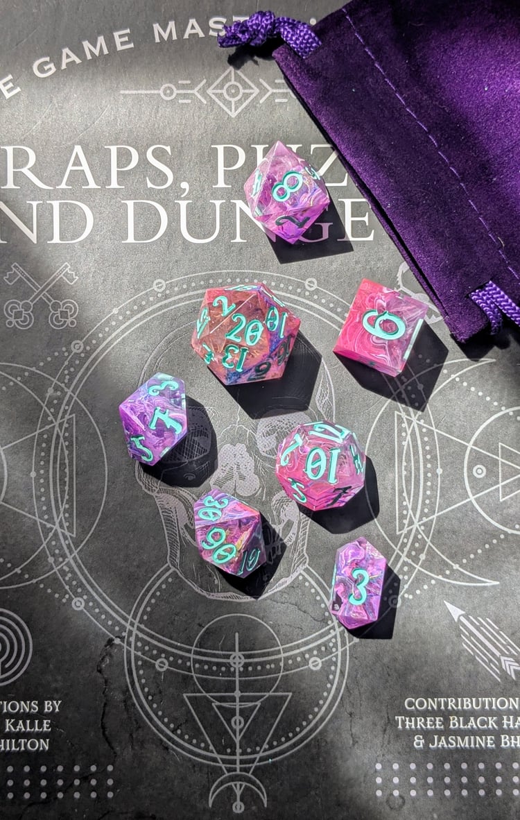 This item is a complete 7-piece polyhedral set (d4, d6, d8, d10, d10, d12, d20) and comes with a velvet bag for secure and stylish containment.
