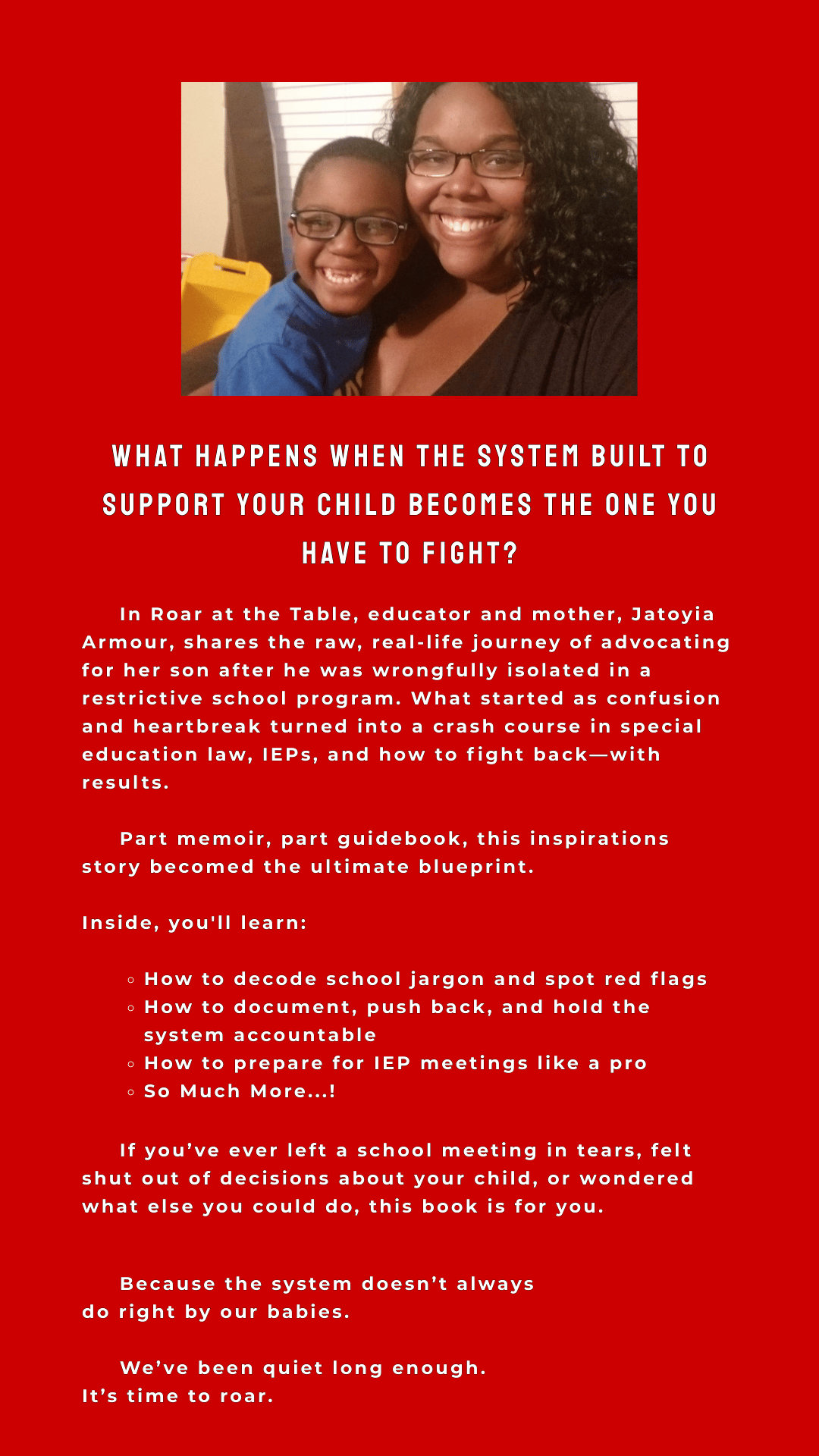 The Roar at the Table Bundle gives parents the complete system for navigating special education with clarity and confidence. The main book teaches you your rights, breaks down complex processes, and shows you exactly how to communicate and advocate for your child. The workbook transforms those lessons into action with templates, planning tools, scripts, trackers, and worksheets you can use throughout the school year.