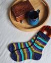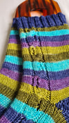 Knit during a bout of Covid, these toe-up self-stripe socks are the perfect combination of entertainment and relaxation. A self stripe yarn for variety and an easy to memorise cable up one side to add interest.