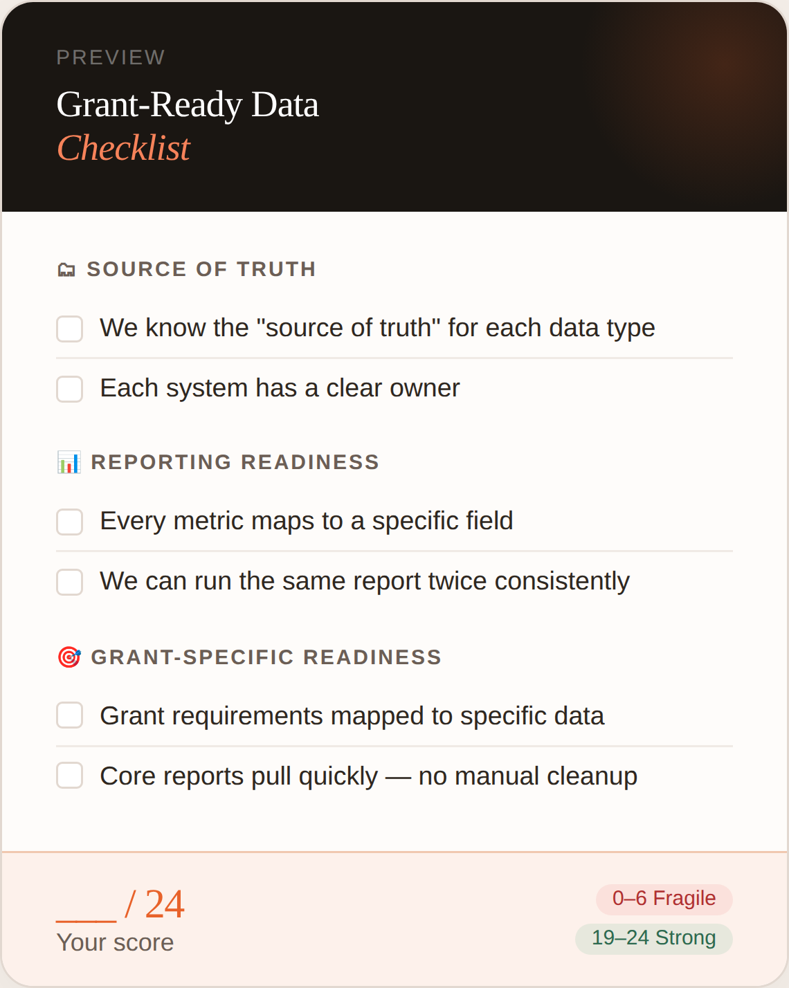 This free checklist walks you through 24 simple yes/no checks across 7 key areas — source of truth, data quality, reporting readiness, intake, automations, permissions, and grant-specific readiness.