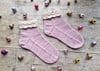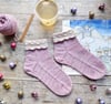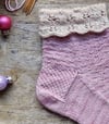 The Violet’s Angel Costume socks feature a pretty folded cuff worked in a simple lacy pattern inspired by the feathered wings of Violet’s costume in the Christmas at Ivy Cottage from the beloved Biscuit, Buttons and Pickles series of books by E. J. Taylor from my childhood. The folded feather cuff hides a practical rib for a comfy fit, and flows into a delicately textured sock, sparkling like the stars on Violet’s dress which she kindly lends to Annie when she is chosen for the role of the angel in the Fern Hill School Christmas play. They are knitted cuff down and finished with an eye of partridge heel flap and a rounded wedge toe.