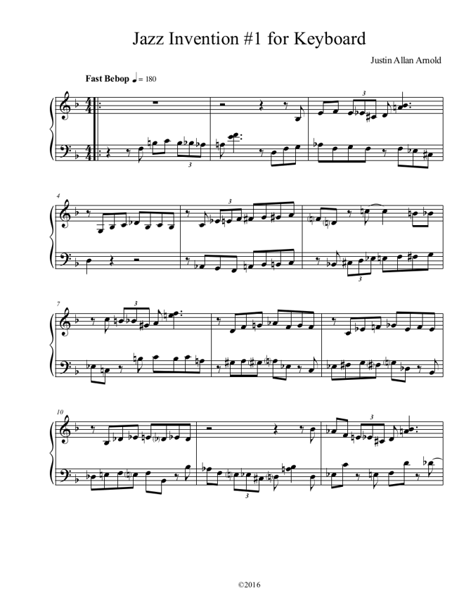 2-page PDF sheet music version of Justin Allan Arnold's "Jazz Invention #1 for Keyboard." Audio version here: http://justinallanarnold.bandcamp.com/track/jazz-invention-1-for-keyboard