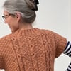 My Crow Steps design is inspired by a distinctive architectural feature found in the city of Ghent, Belgium. Ghent has many beautiful buildings with “crow stepped gables”, a stair-step feature surrounding a triangular gable. Dating back to the 12th Century, the crow steps provided convenient roof access, particularly for roofers and Chimney Sweeps. In my side-on photo of the crow-steps, shown above, each step is clearly visible along with other features such as tiles and bricks. These features inspired the bold textured cable panel, with long lines of cables bordered by a twisted stitch and textured check pattern. The sides of the garment are also knitted in the textured check. The neck band and grown-on sleeves are knitted in rib.