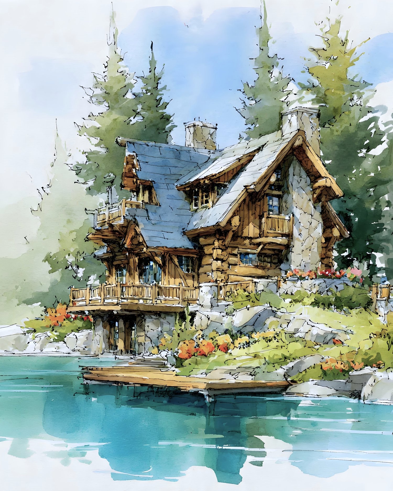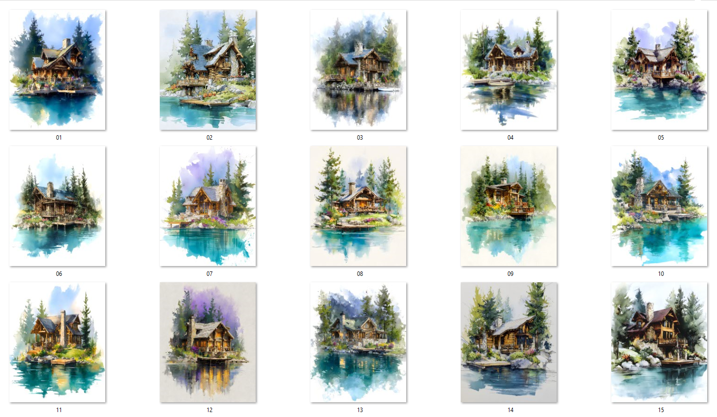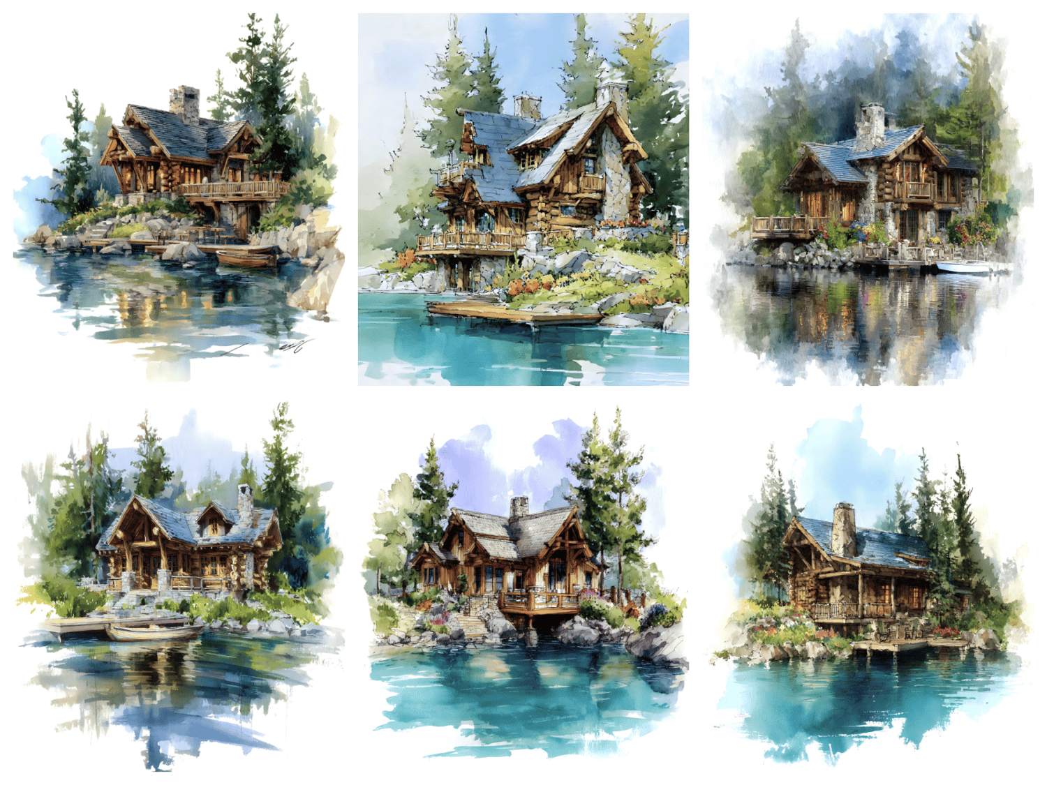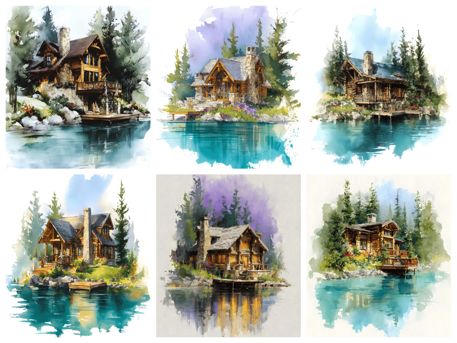 15 AI-generated digital art prints – Noon at the Lake – Watercolor Forest Cabin Art Prints, whimsical manor illustration, fantasy house. High resolution 300 DPI, 8:10 format, 2400x3000 pixels, ready for print or digital use. Instant download, no physical product. Commercial license included.