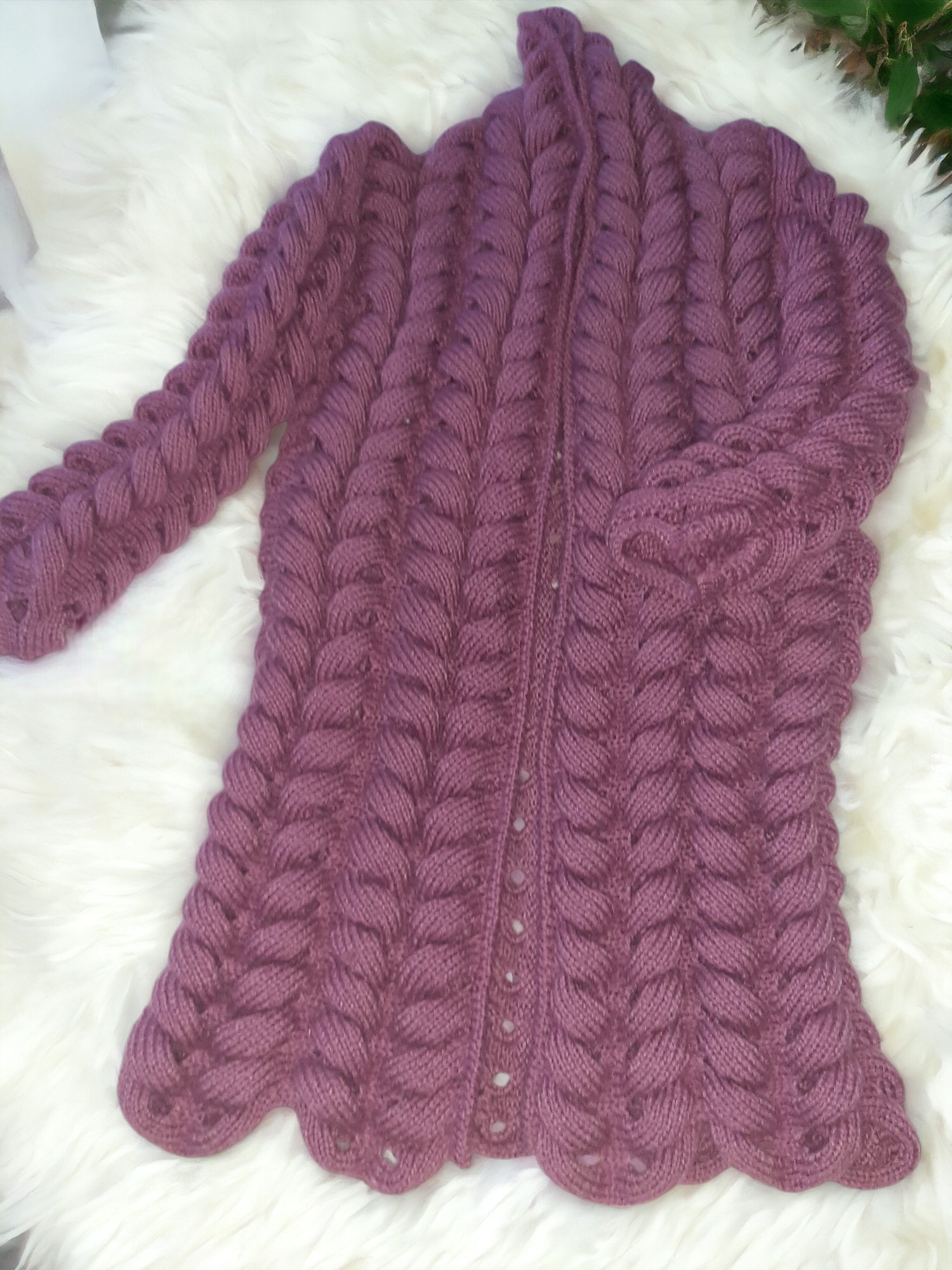 This gorgeous 120cm long 3D patterned mohair cardigan offers elegance and comfort. It has a striking, high collar and was designed not to button at the front, creating a relaxed and romantic look.