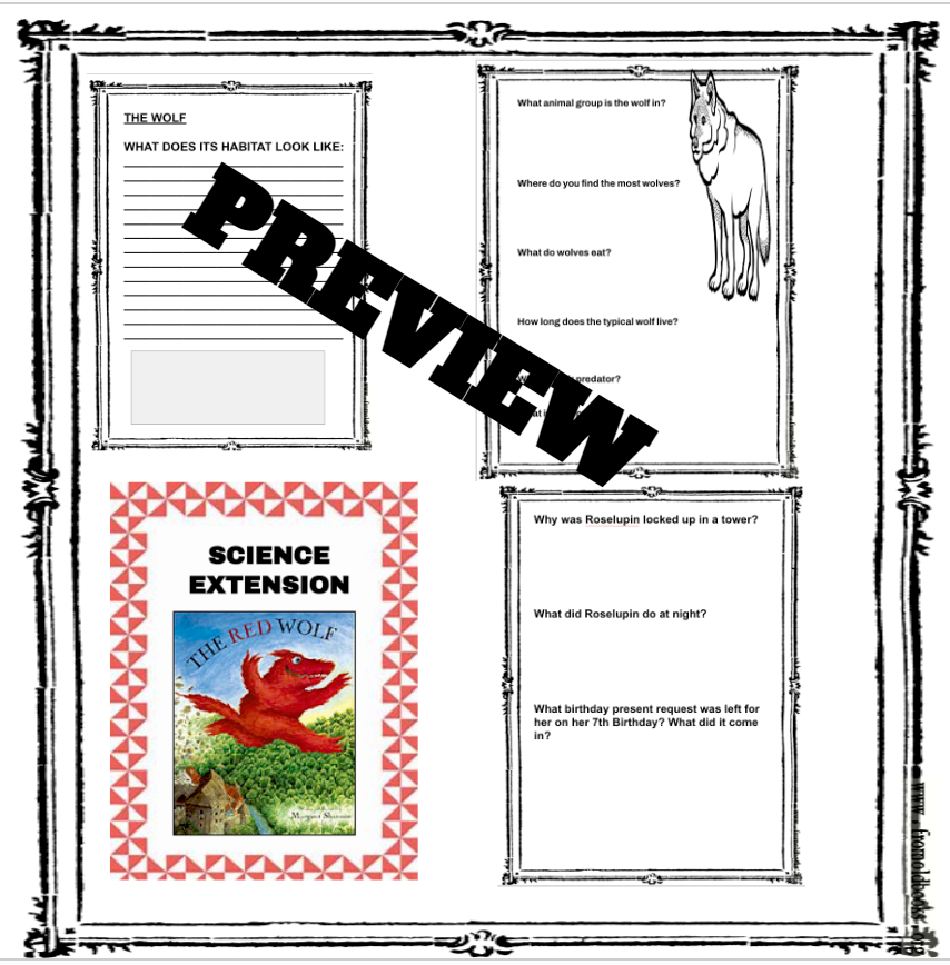 This 30-page, no prep, unit of reading and ELA lessons, ready-to-use resources and activities unit was created to use with The Red Wolf by Margaret Shannon. This book is about a little girl, Roselupin, put into a tower by her father, the king, because "The world is a wild and dangerous place." On her seventh birthday, she got a gold box, inside was yarn and it said "Knit what you want" and the king laughed. The story is engaging and loved my children who love fairy tales.