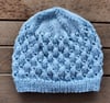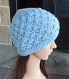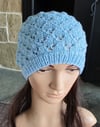 This 8ply/DK Beanie has a rib brim, is worked in a lovely lace stitch then has an easy to work stocking stitch crown.