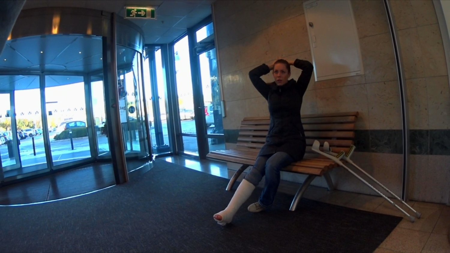 Melinda has been sad lately when she was forced to sit at home after her accident but today she has finally come out and is now on her way to a shopping center.She has a plaster SLWC on her right leg and we can clearly see her cast as she rolled up her pants on her hurt leg.We follow her when she crutch in and around at the shopping center and of course there will be both closeups and great crutching in this clip.