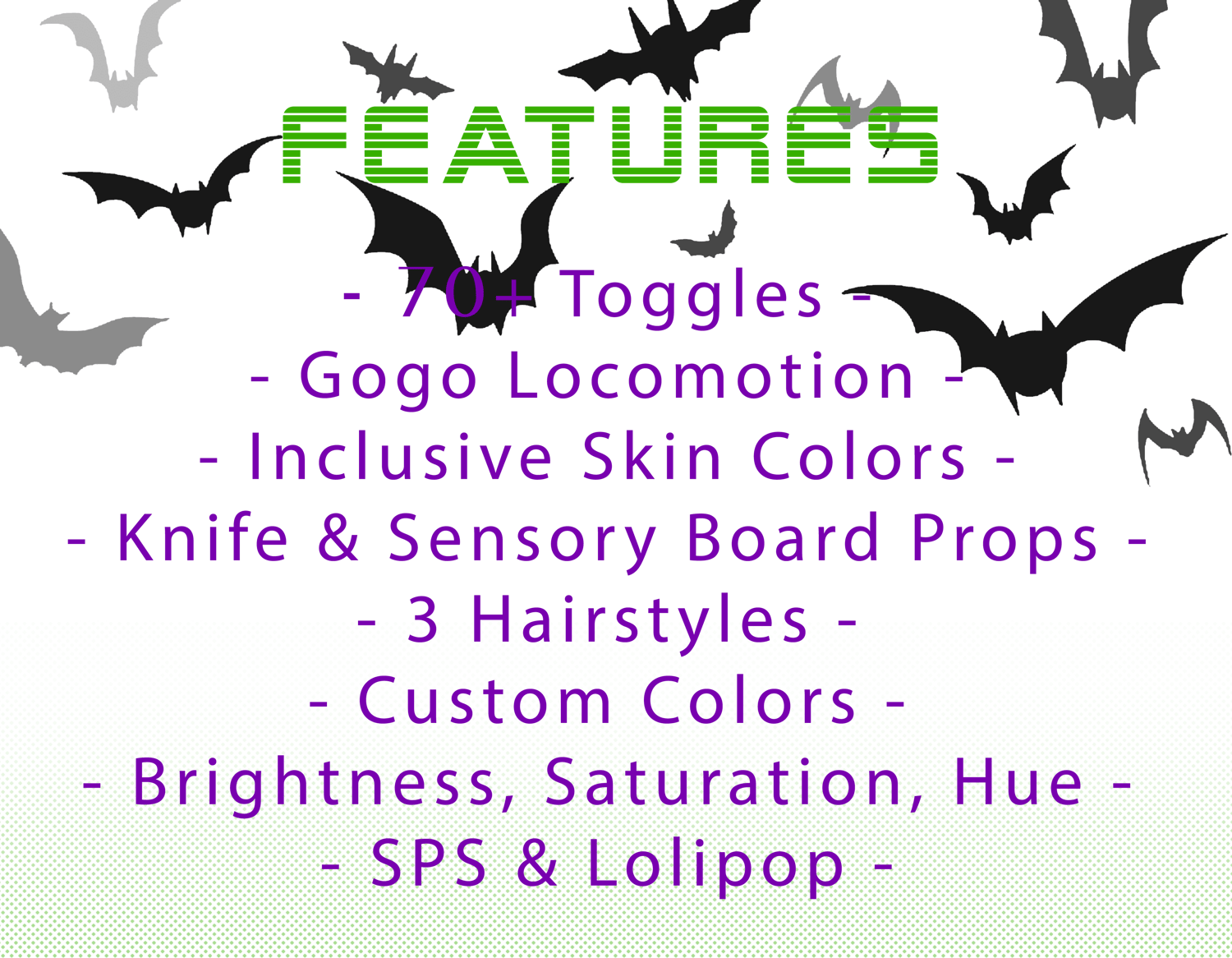MAKE SURE YOUR VRCHAT SDK IS UP TO DATE (SDK 3.9). THIS AVATAR USES UPDATED SHADERS THAT ARE NOT AVAILABLE IN PREVIOUS VERSIONS