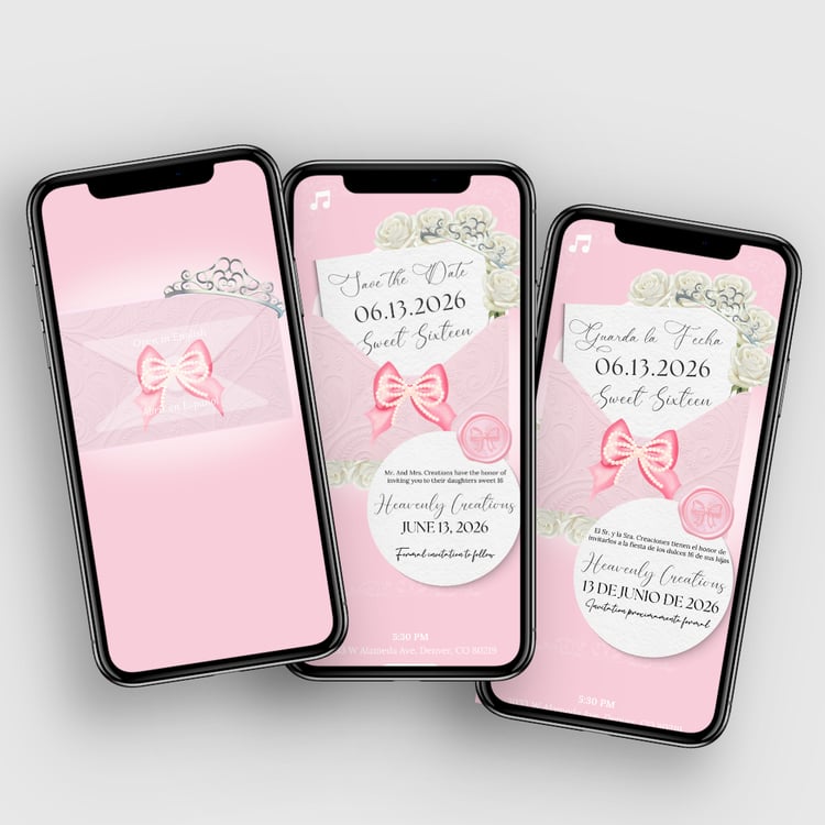 This is a self-editable digital private website Save the Date invitation for a Quinceañera. After purchase, you will receive access to edit the template yourself and personalize all event details. Your guests will receive a custom link to view your event information in an elegant, interactive website format.