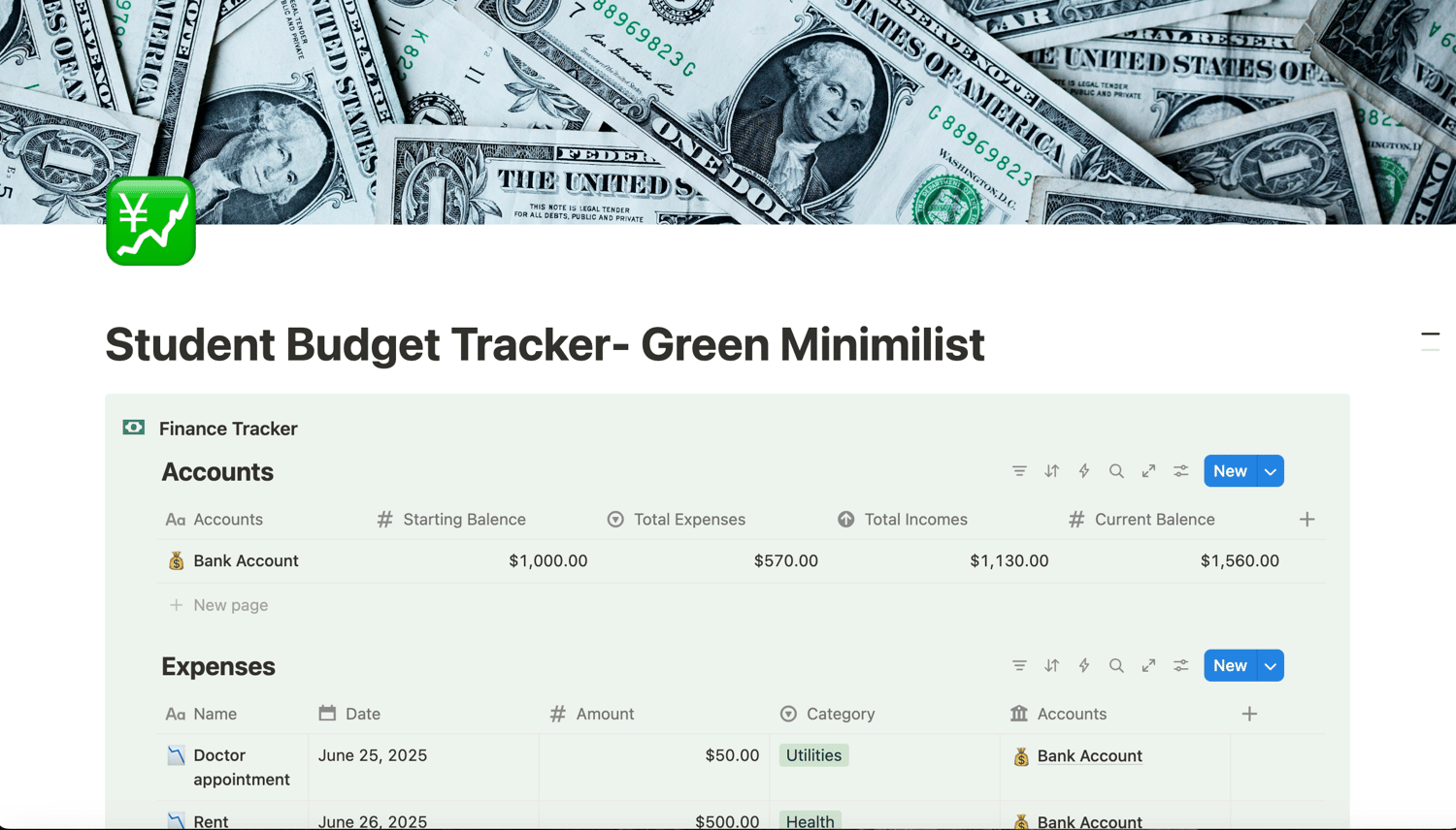 Built with a calming minimalist green aesthetic, this template keeps your finances organised without the clutter. Ideal for students, casual workers, or anyone wanting a simple system to manage money in Notion.