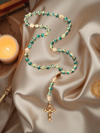 Stunning handmade rosary featuring turquoise and champagne crystal beads with brilliant sparkle. Premium cord-based construction with ornate golden cross and centerpiece medallion.