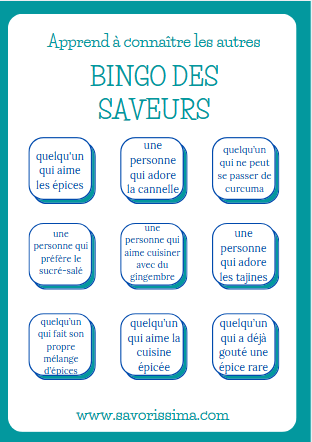 Envie d'un jeu fun et gourmand pour briser la glace? Découvrez le Bingo des saveurs, une version épicées du jeu classique, parfaite pour animer vos ateliers de cuisine, vos évènements entre passionnés de gastronomie ou simplement pour s'amuser entre amis!