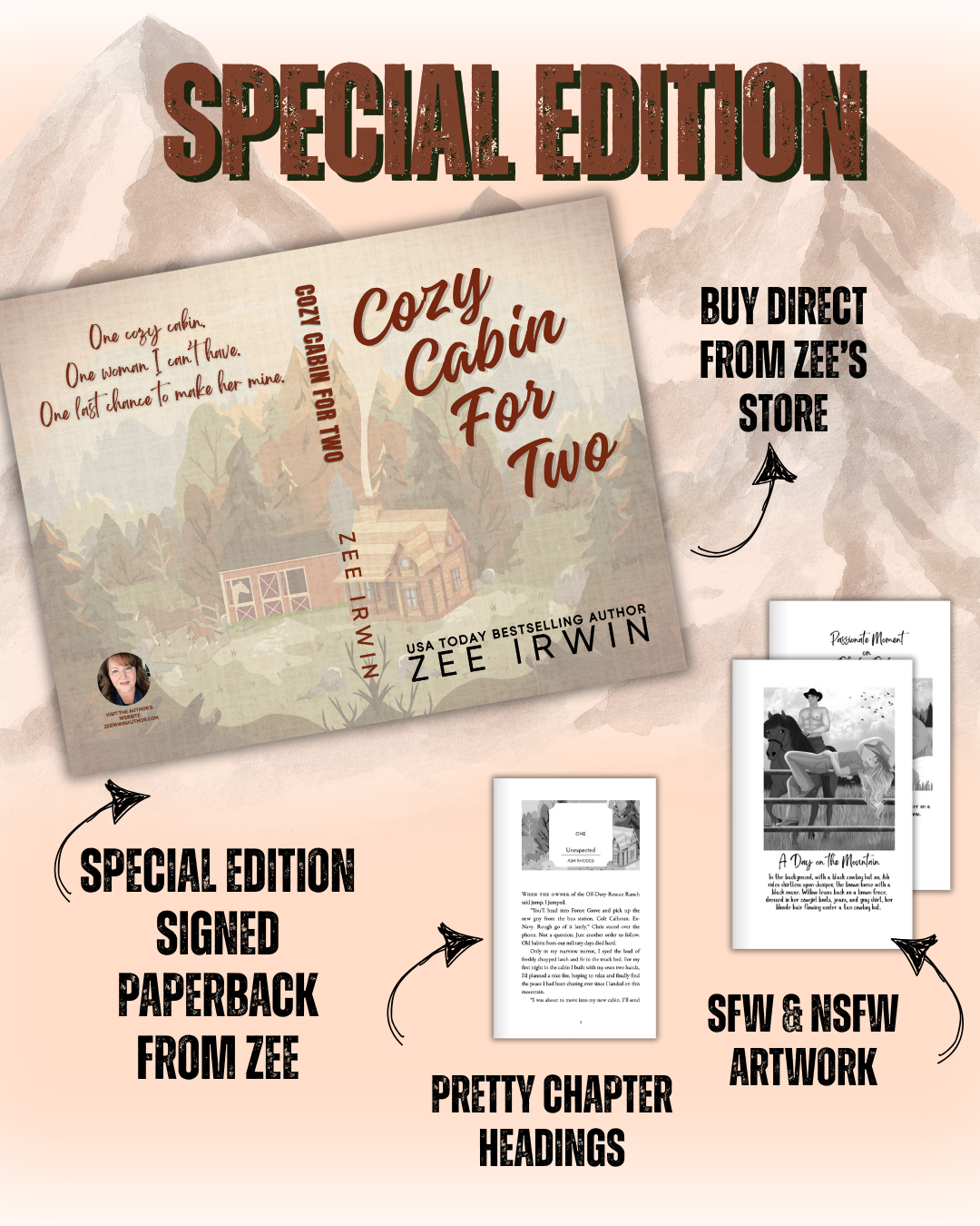 Cozy Cabin For Two Special edition, created by Zee Irwin, includes Zee's signature, custom chapter headings, pretty title page, and two artwork in black and white published directly inside the interior, one NSFW, and one SFW.