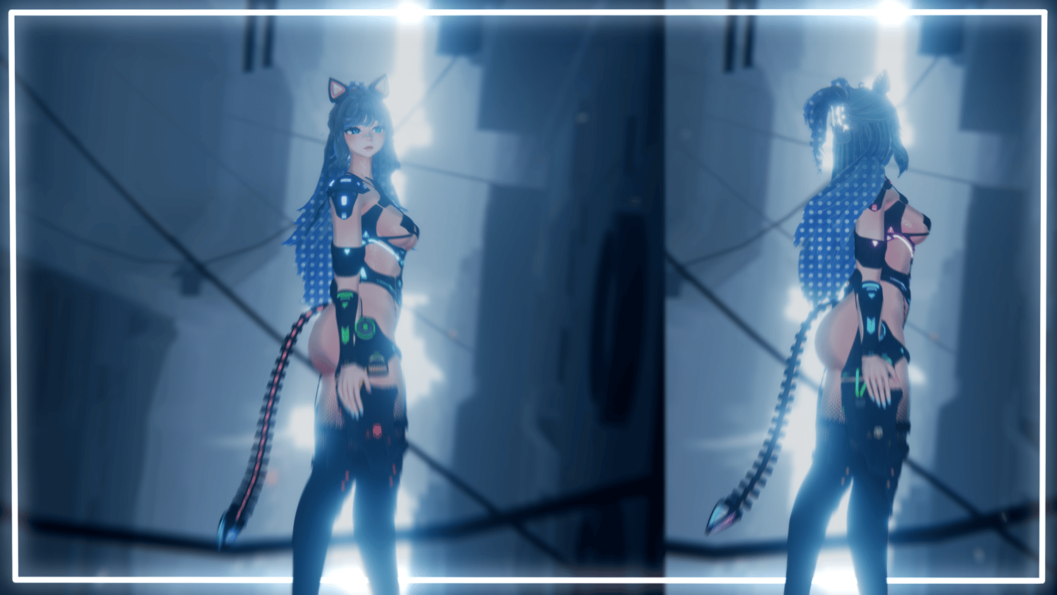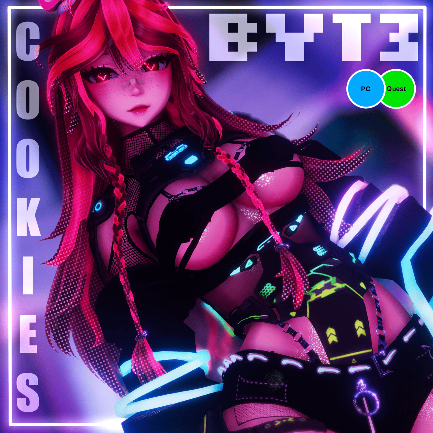 Byte has over 70+ toggles. she had multiple hair lengths, bang swap and options. All her clothing and accessories includes material swap with a hue shift for the pink color and accents. Her RGB emissions on her clothing also are a toggle, including a solid color option with a hue shift. Her Quest version Keeps most of the toggles with the exception of the fishnets, tail and Hue shifts.