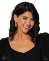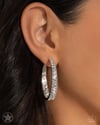 The front facing surface of a chunky silver hoop is dipped in brilliantly sparkling rhinestones while light-catching texture wraps around the back. The interior of the hoop features the opposite pattern, creating the illusion of a full hoop of blinding rhinestones. Earring attaches to a standard post fitting. Hoop measures 1 3/4" in diameter.
