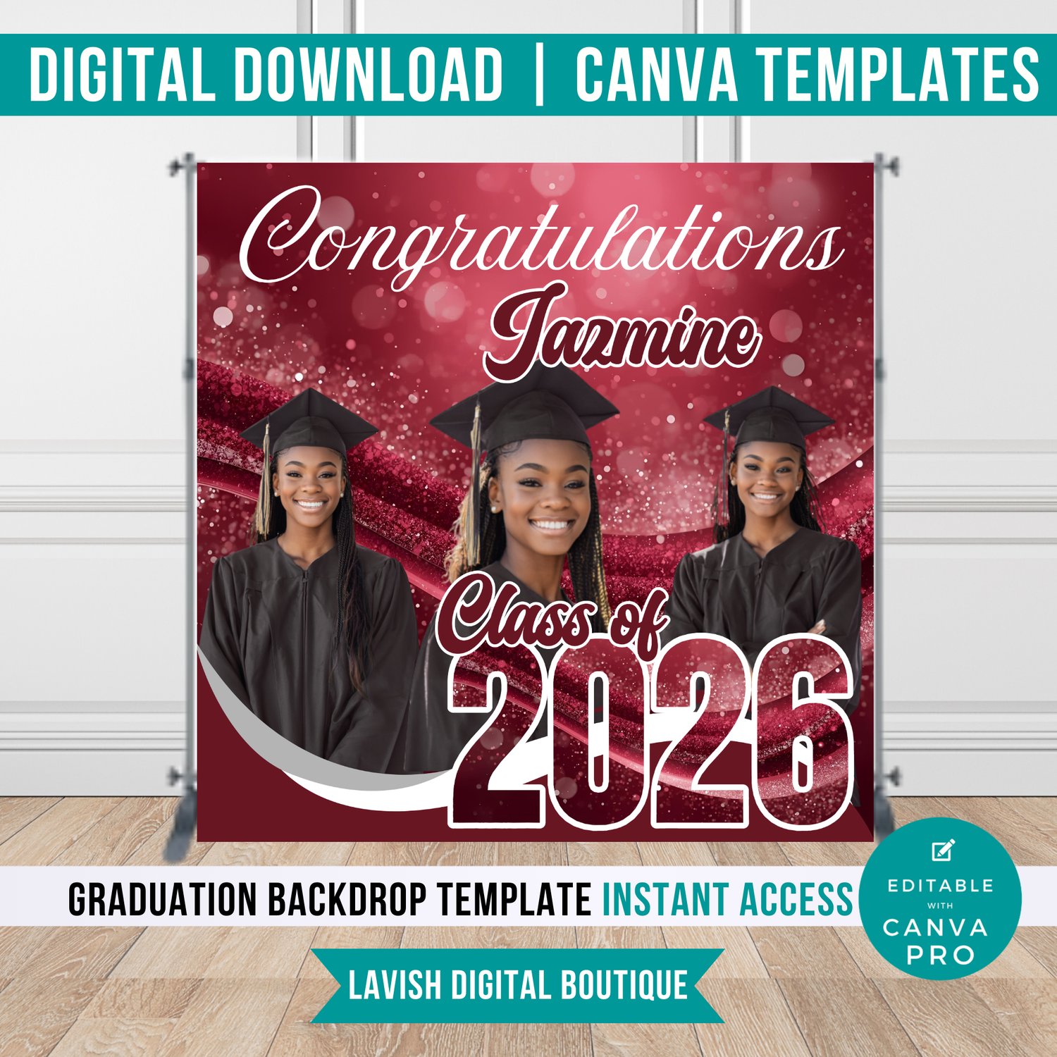 This listing is for 1 digital backdrop design template. The design is editable in Canva, so you can change the text and font s to suit your style. You can even add your own images or logo to make it truly unique. The file is layered for easy editing, but Canva experience is necessary. The Background and "2026" cannot be edited.