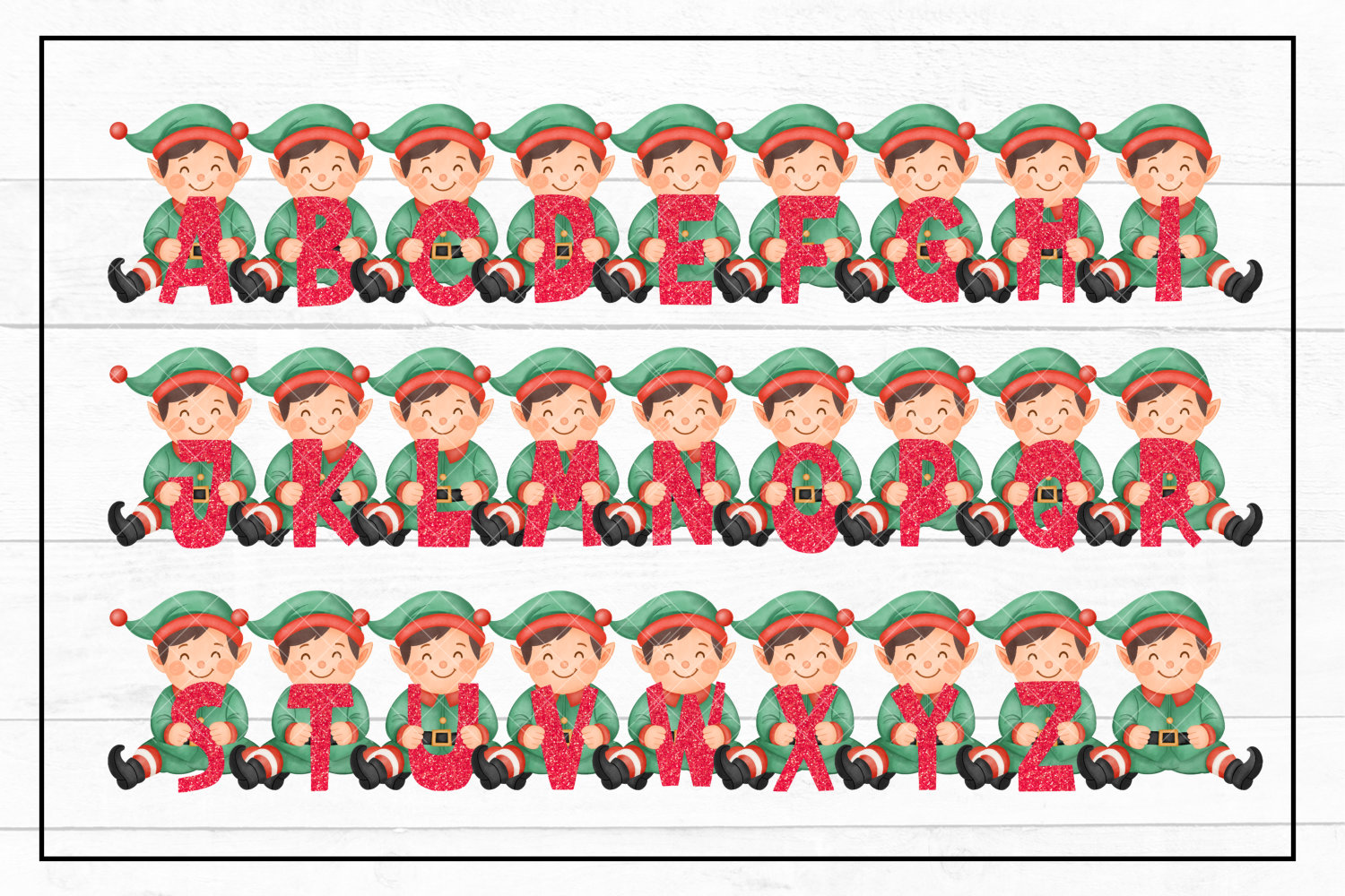 This listing is for a ELF ALPHABET you get a cute BOY ELF holding a red glittery letter of the Alphabet. You get the letters A to Z as well as a blank. You also get 3 shelves in red, green and wood if you want to sit the Elf. These are hand drawn high resolution PNG files and are great for everything festive from sacks and ornaments to cards and mugs.