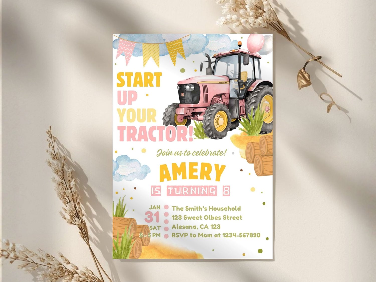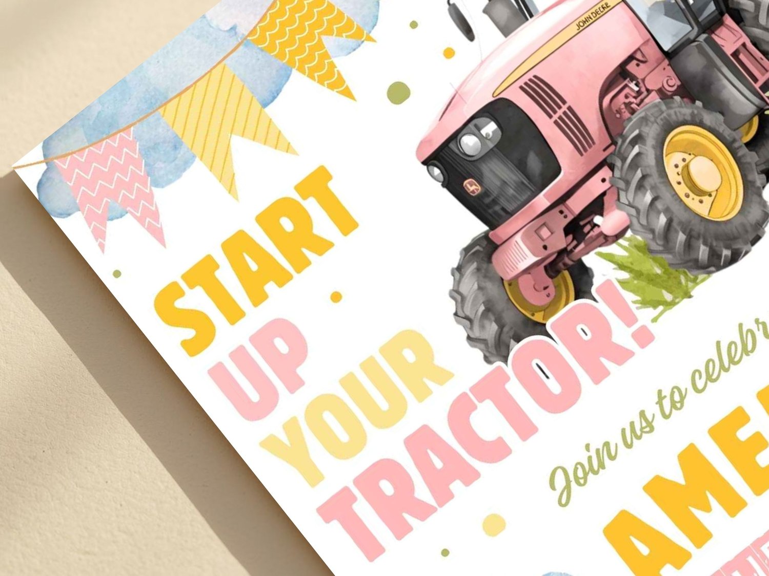 Celebrate your little farmer’s big day with this adorable Pink Tractor Birthday Invitation. Ideal for a tractor birthday party, farm birthday theme, or girl tractor party, this charming invitation features a cute watercolor tractor, playful bunting flags, and soft country colors that kids and parents love.