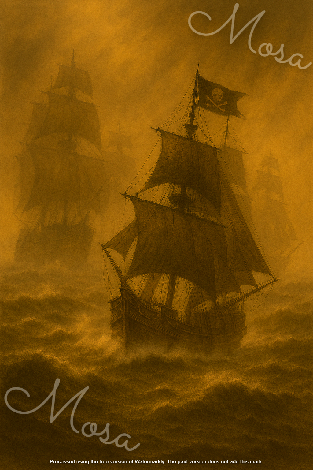 Amid raging waves and a sky ablaze with stormlight, phantom pirate ships emerge from the mist-silent, haunting, unstoppable. Their tattered sails whisper tales of lost treasures and eternal pursuit across cursed waters.
