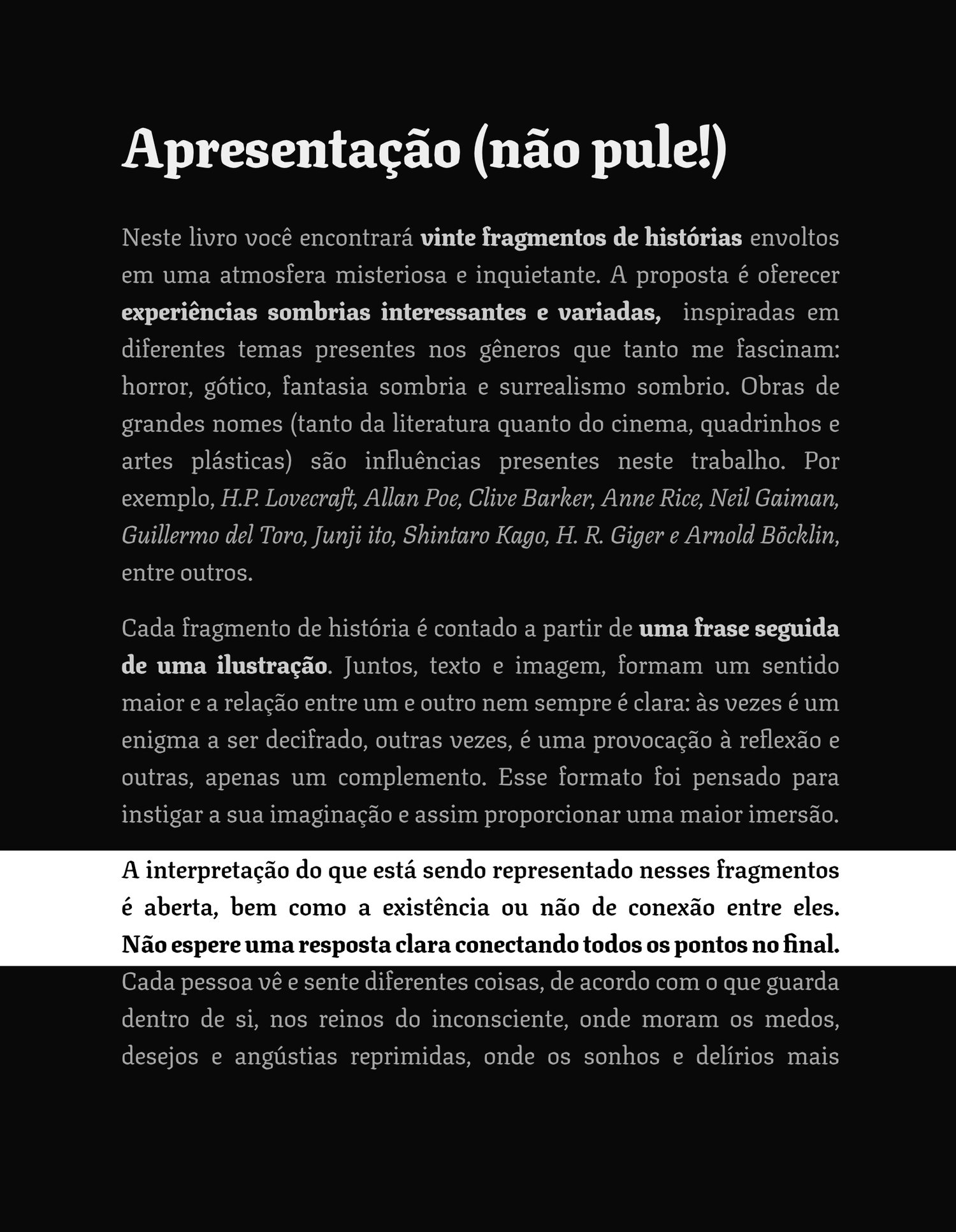"Mais que um livro de ilustrações, o Experiências Sombrias é um laboratório para experimentarmos o terror, a angústia, a melancolia e, quem sabe, acolhimento.
