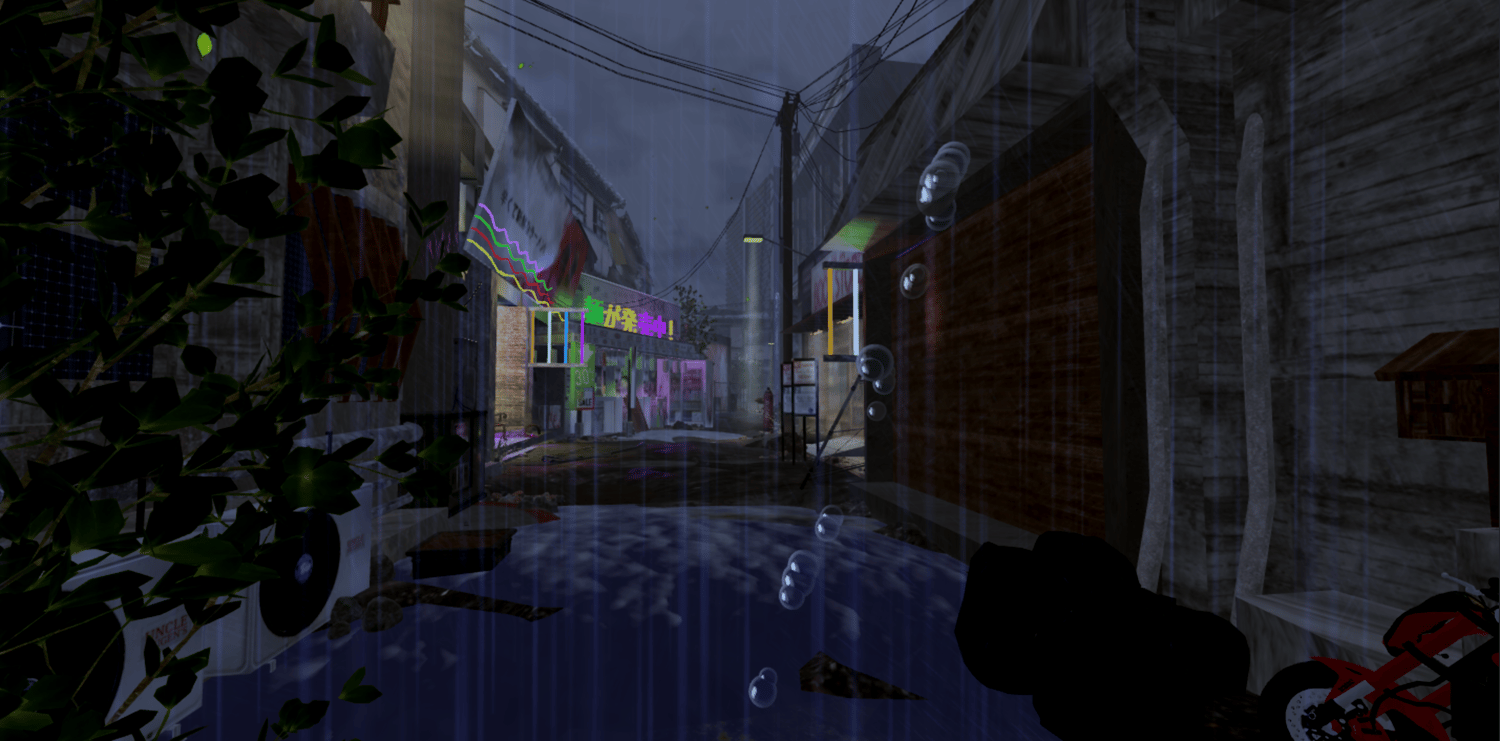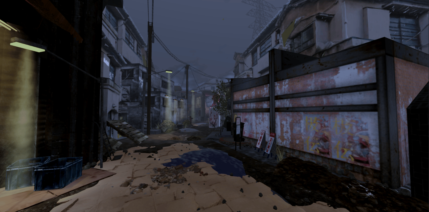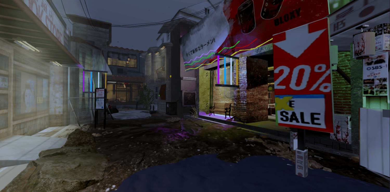A post-apocalyptic Japanese street featuring decaying storefronts, glowing neon signs, and overgrown vegetation reclaiming the urban ruins. Wet cracked pavement, scattered debris, flooded alleyways, and weathered buildings create an eerie abandoned atmosphere. Vibrant neon lights in pink, green, and blue contrast against grimy textures and cherry blossom trees pushing through the decay. Detailed props include vending machines, shop interiors, wooden ramps, and rusted fencing. The layout supports exploration through tight alleys and open street sections. Perfect for post-apocalyptic games, horror experiences, cyberpunk projects, survival games, or cinematic showcases.