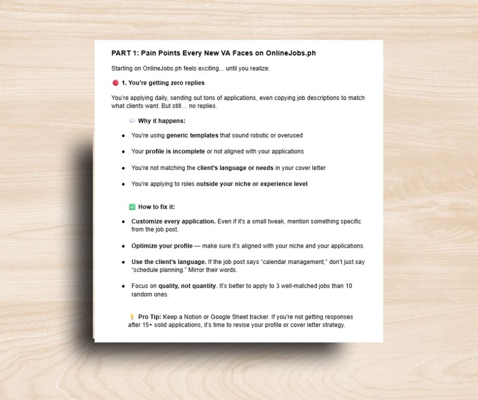 This eBook is designed to help aspiring and beginner Filipino VAs stop guessing and start applying with strategy. If you’re tired of silent applications, confusing job posts, and wasting your daily points — this guide is for you.