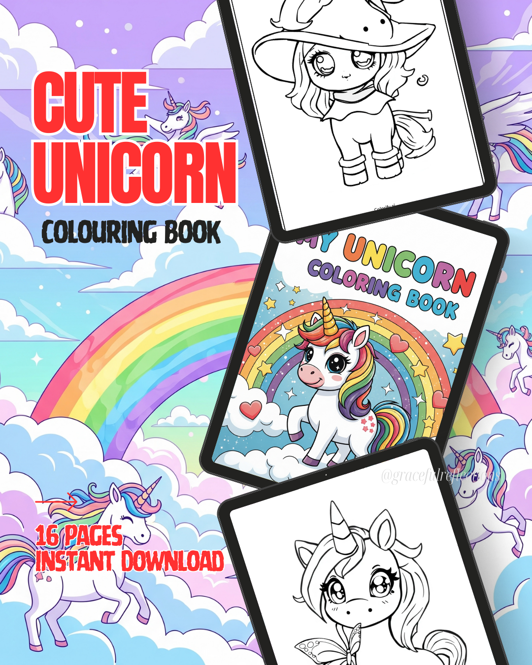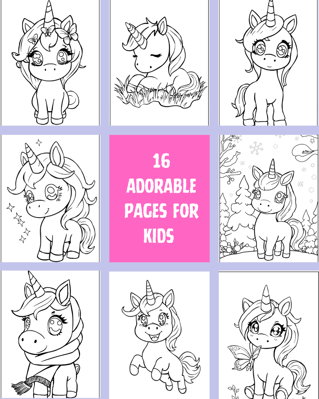 - 16 unique cute unicorn colouring pages (PDF, A4 size β ready to print)