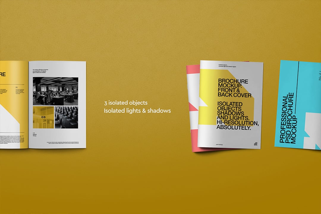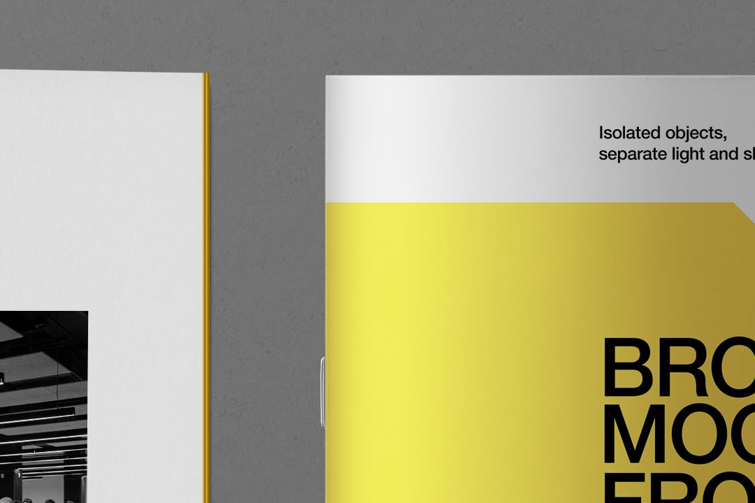 Photorealistic A4 brochure mockup pack with three flat-lay scenes, editable lights & shadows and Smart-Object layers.