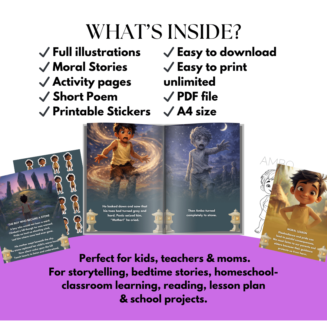 A story about a stubborn boy named Ambo who ignores his mother’s warning and climbs a forbidden hill. Guarded by spirits, he is turned into stone as a result of his disobedience and pride. The tale teaches that listening to parents and elders is important, and rules exist for a reason.